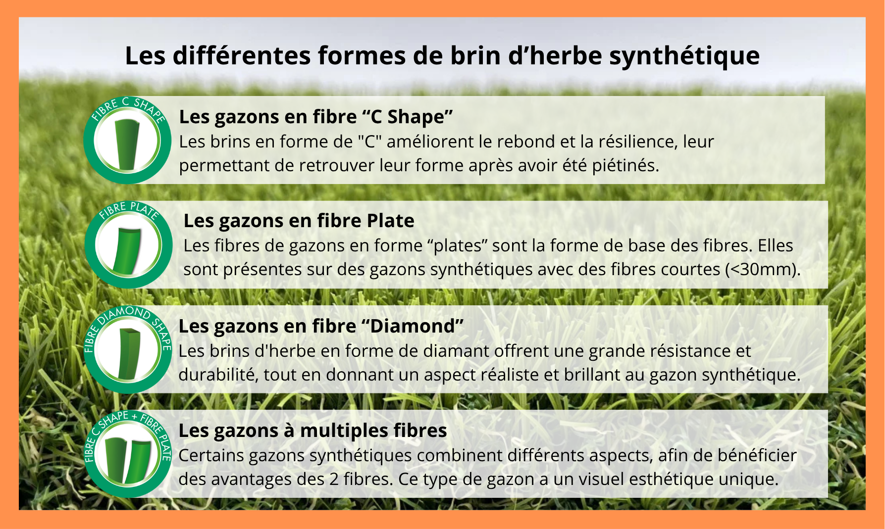 Les fibres peuvent être en polypropylène ou polyéthylène, et leur forme varie : en C Shape, plate, W Shape ou diamant. Certaines sont conçues pour mieux se redresser après avoir été écrasées et pour résister à la chaleur et aux UV. Une fibre de meilleure qualité conserve son aspect naturel plus longtemps, évite le jaunissement et permet d’obtenir un gazon agréable au toucher, même après plusieurs années d’exposition au soleil. Pour un balcon ou une terrasse, choisir des fibres résistantes garantit que votre espace reste vert et accueillant sans entretien intensif.