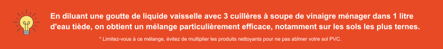 Sur des zones localisées et pour les tâches difficiles à enlever sur le sol PVC, vous pouvez diluer 1 goutte de liquide vaisselle dans un peu d’eau chaude. A l’aide d’une serviette microfibre, frottez avec précaution la surface de sol tâchée.