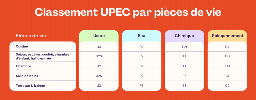 Ci-dessous, voici les différents facteurs de dégradation relevés par la classification UPEC. Chaque facteur de dégradation possède une lettre qui lui équivaut, soit U pour l’usure, E pour l’entretien et le lavage, C pour chimique et P pour poinçonnement.