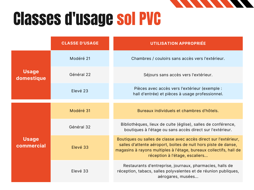 Il existe un système de classification des revêtements de sol, tels que les vinyles, instauré par la norme européenne NF EN 685. Il attribue à chaque sol une classe d’usage. Chaque classe d’usage spécifie la zone ou le local le plus approprié à l’utilisation du revêtement de sol vinyle.
