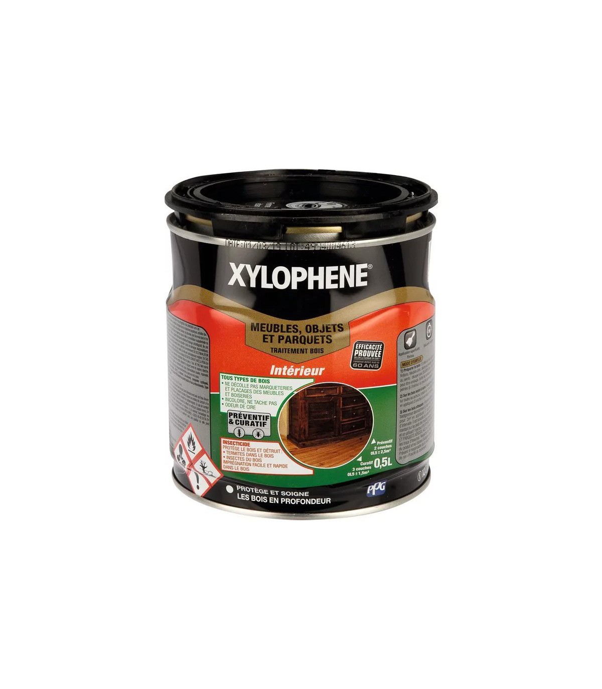 XYLOPHENE Meubles, objets et parquets est un produit préventif et curatif pour traiter les meubles intérieurs (anciens, massifs, plaqués ou marquettés). Ce traitement des bois est prêt à l'emploi et accepte toutes finitions (cire, vernis, huile, lasure, peinture).