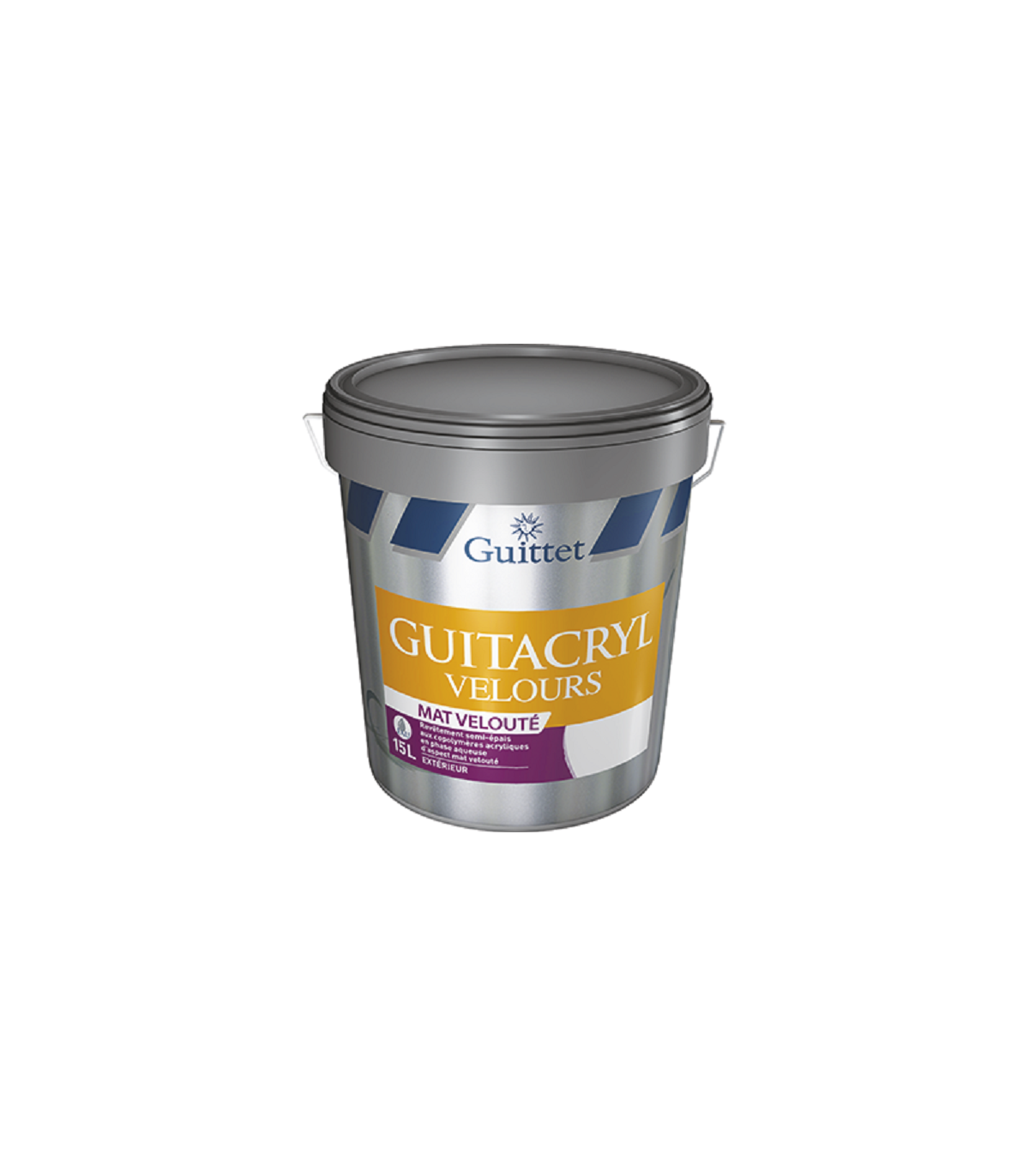 La peinture Guitacryl Velours de GUITTET est conçue pour protéger et décorer les façades extérieures. Adaptée aux supports en béton, enduits de ciment et anciens revêtements rénovateurs, elle offre un haut pouvoir garnissant qui masque les imperfections comme le faïençage ou les fissures superficielles.