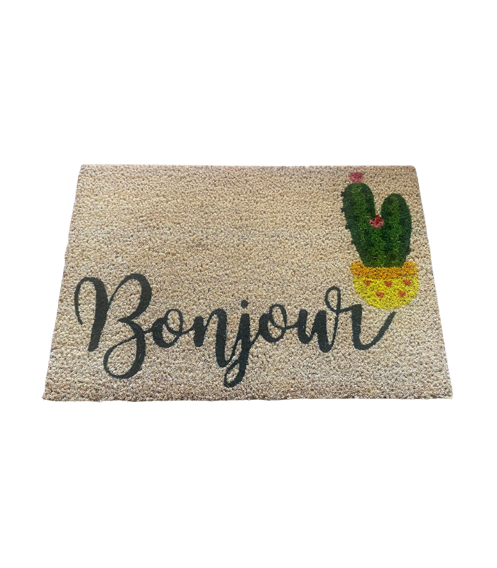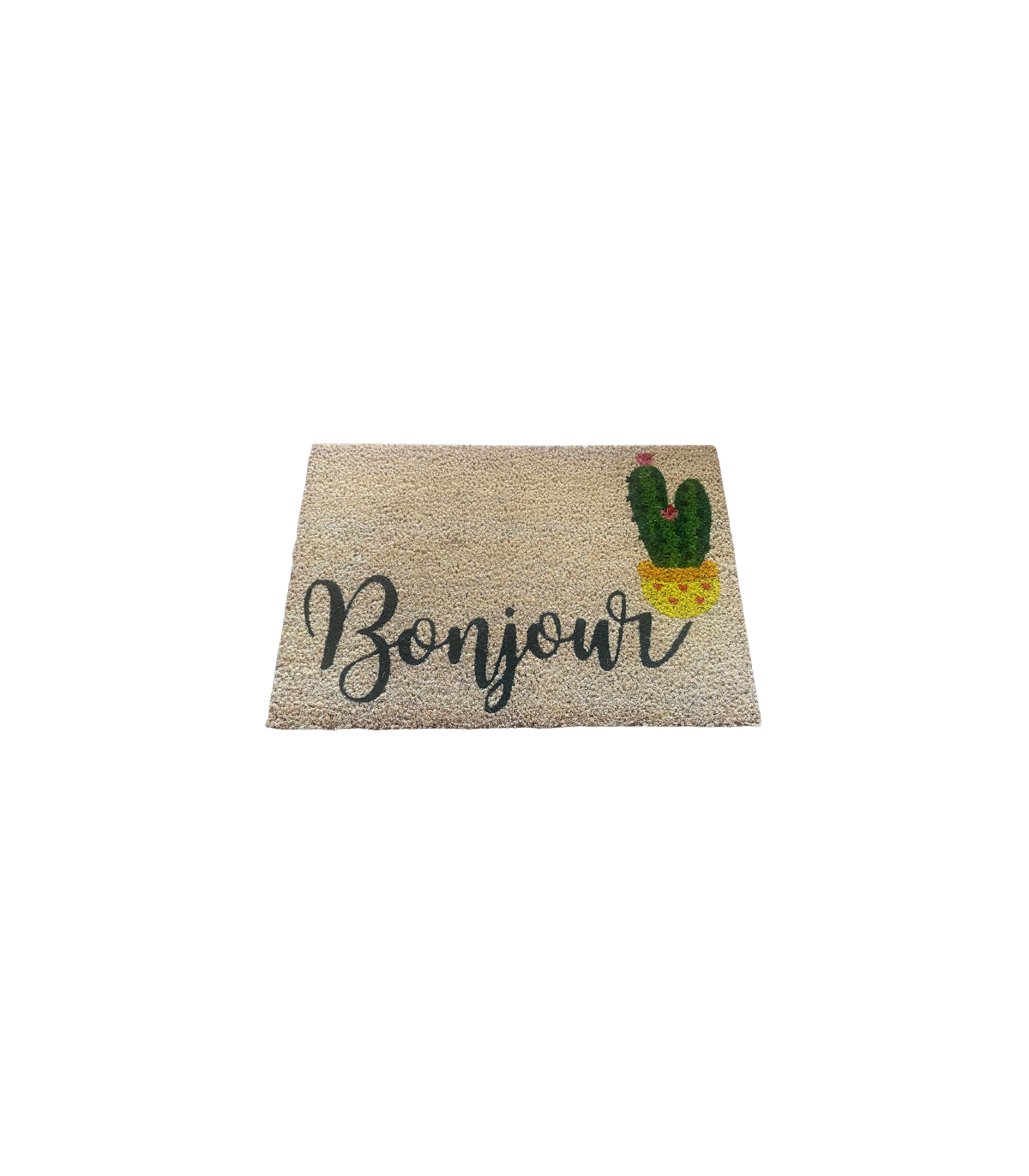 Ce paillasson NOVOTEX est en fibre de coco, 100% naturelle et végétale semelle PVC. Imprimé « Bonjour et cactus ».