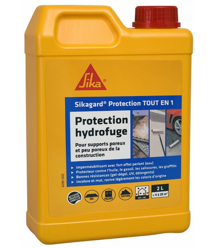 Protection hydrofuge Sikagard tout en un. Applicable sur supports poreux et peu poreux en intérieur ou extérieur. Protège durablement les supports minéraux contre la pénétration de liquides à base d'eau et d'huile. Réduit et prévient de l'encrassement et des taches.