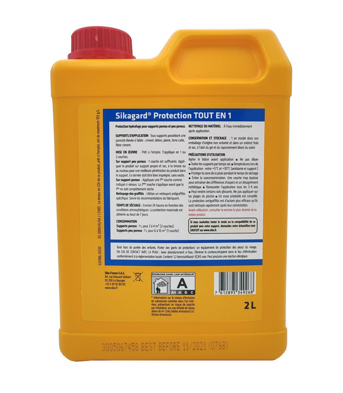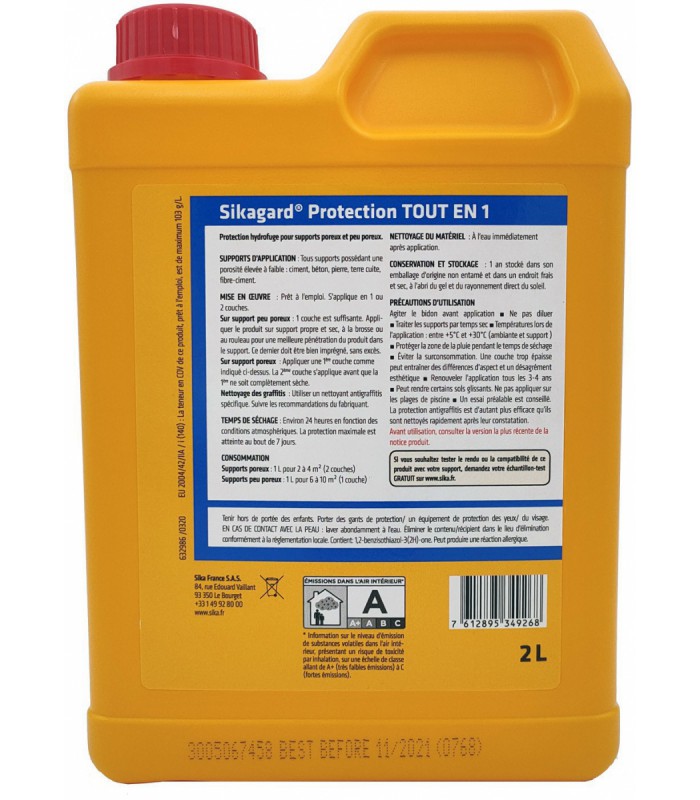 Le Sikagard® Protection Tout en 1 est un produit hydrofuge prêt à l’emploi, spécialement formulé pour protéger les matériaux poreux contre l’eau, les salissures et les agressions extérieures. Avant l’application, le support doit être soigneusement préparé : il doit être propre, sec et débarrassé de toute poussière, trace de graisse, mousse ou pollution. Le produit s’applique directement, sans dilution, à la brosse, au rouleau ou au pulvérisateur basse pression, en veillant à bien homogénéiser le contenu du bidon pendant environ 10 secondes avant ouverture.