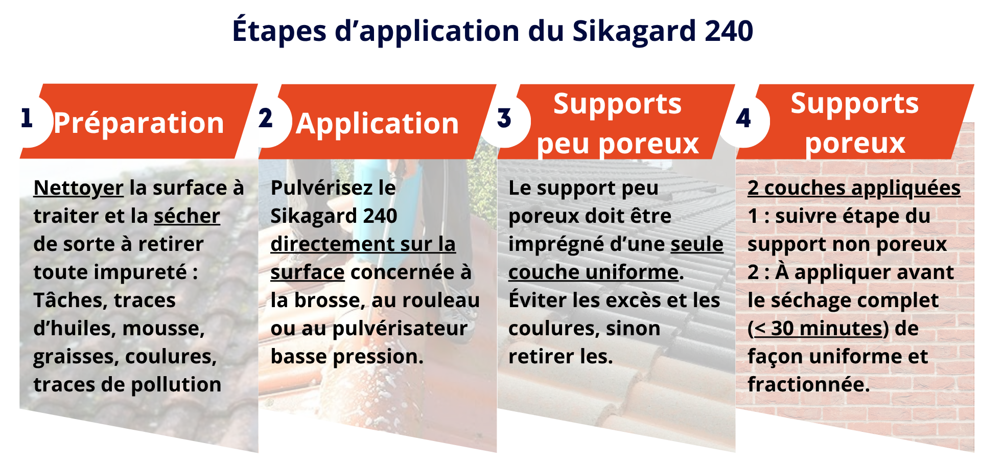 En cas de présence de mousses, moisissures ou autres salissures organiques, vous devez également les retirer avant de commencer à appliquer le produit. Ensuite, attendez le séchage complet du support pour poursuivre le processus.