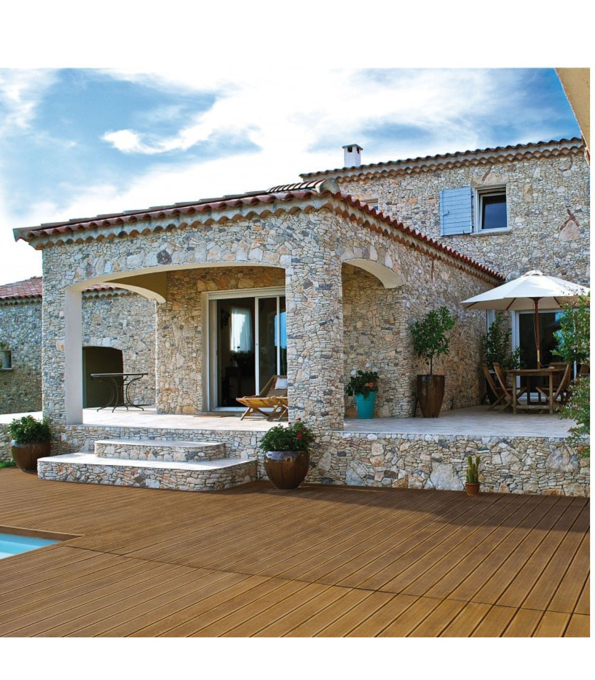 - Extérieur : mobilier de jardin, terrasses, caillebotis, ponts de bateaux, œuvres mortes sur bateaux, portails...