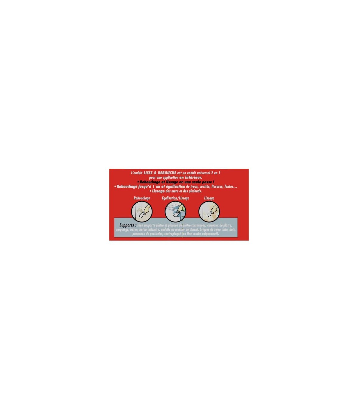 - Après séchage complet, l'enduit Lisse & Rebouche peut recevoir tous types de décorations : papier peint, revêtement mural, peinture ou carrelage.