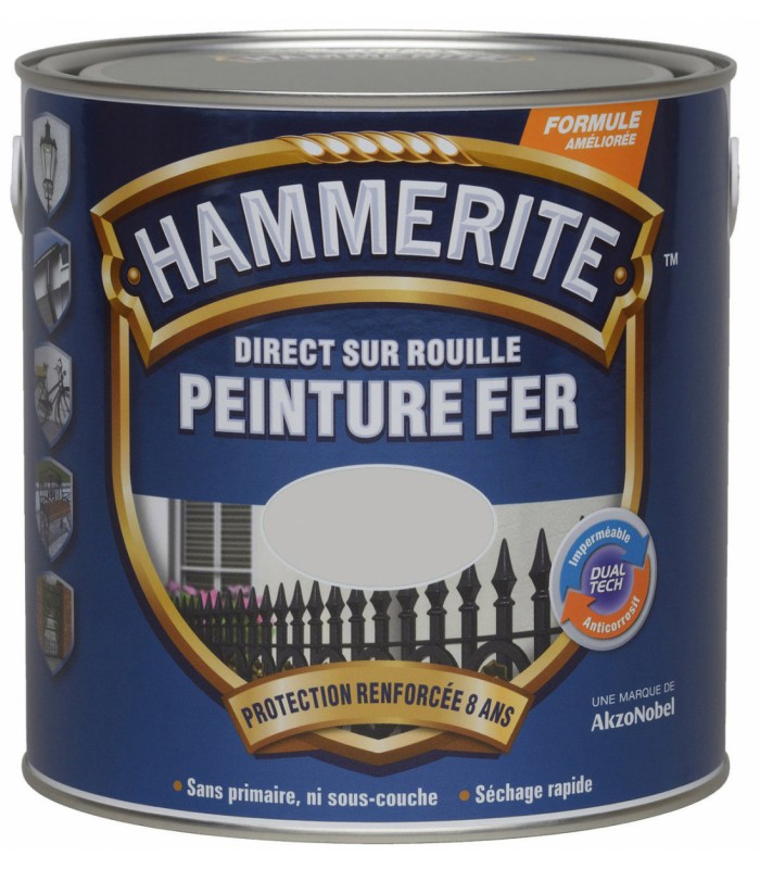 • Gris : Toutes les teintes de gris des peintures Hammerite de ferronnerie apportent une touche moderne et métallique. La peinture Hammerite Peinture fer Forgé en gris zinc ou acier brossé sont parfaite pour donner un effet industriel aux surfaces métalliques.