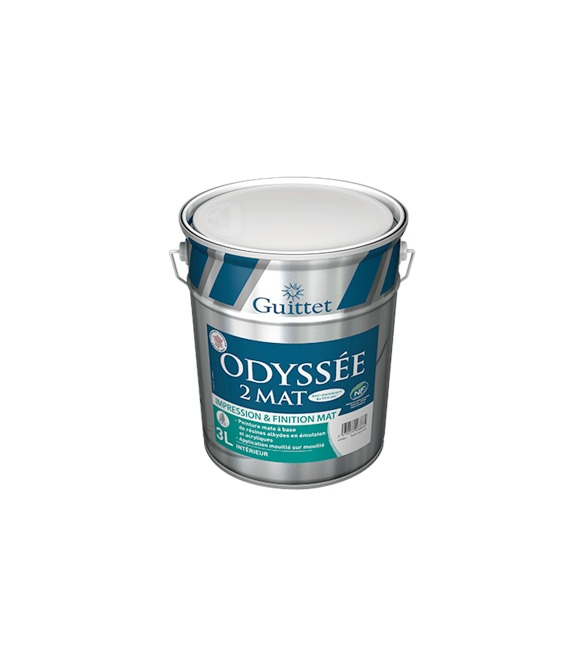 La peinture GUITTET ODYSSÉE 2 MAT est une peinture d’impression et de finition, applicable en direct sur les supports intérieurs : plâtre, plaque de plâtre, bois, PVC. Ce type de peinture offre un excellent rendu sur vos murs et plafonds. GUITTET ODYSSÉE 2 MAT est une peinture à base de résines alkydes en émulsion et acryliques. Elle est totalement lessivable sans aucune dégradation des couleurs.