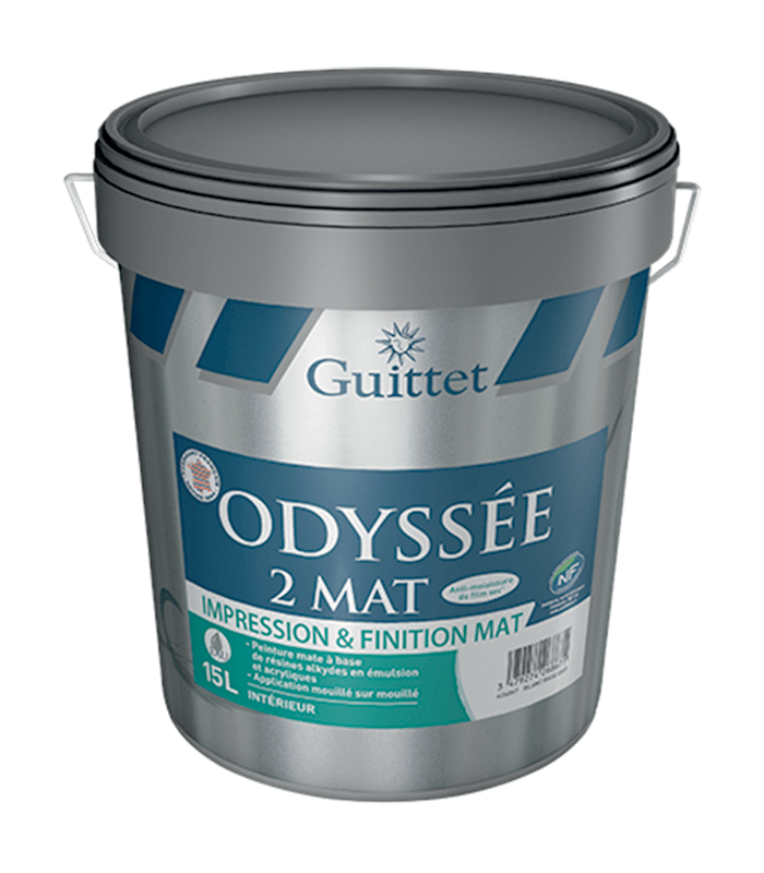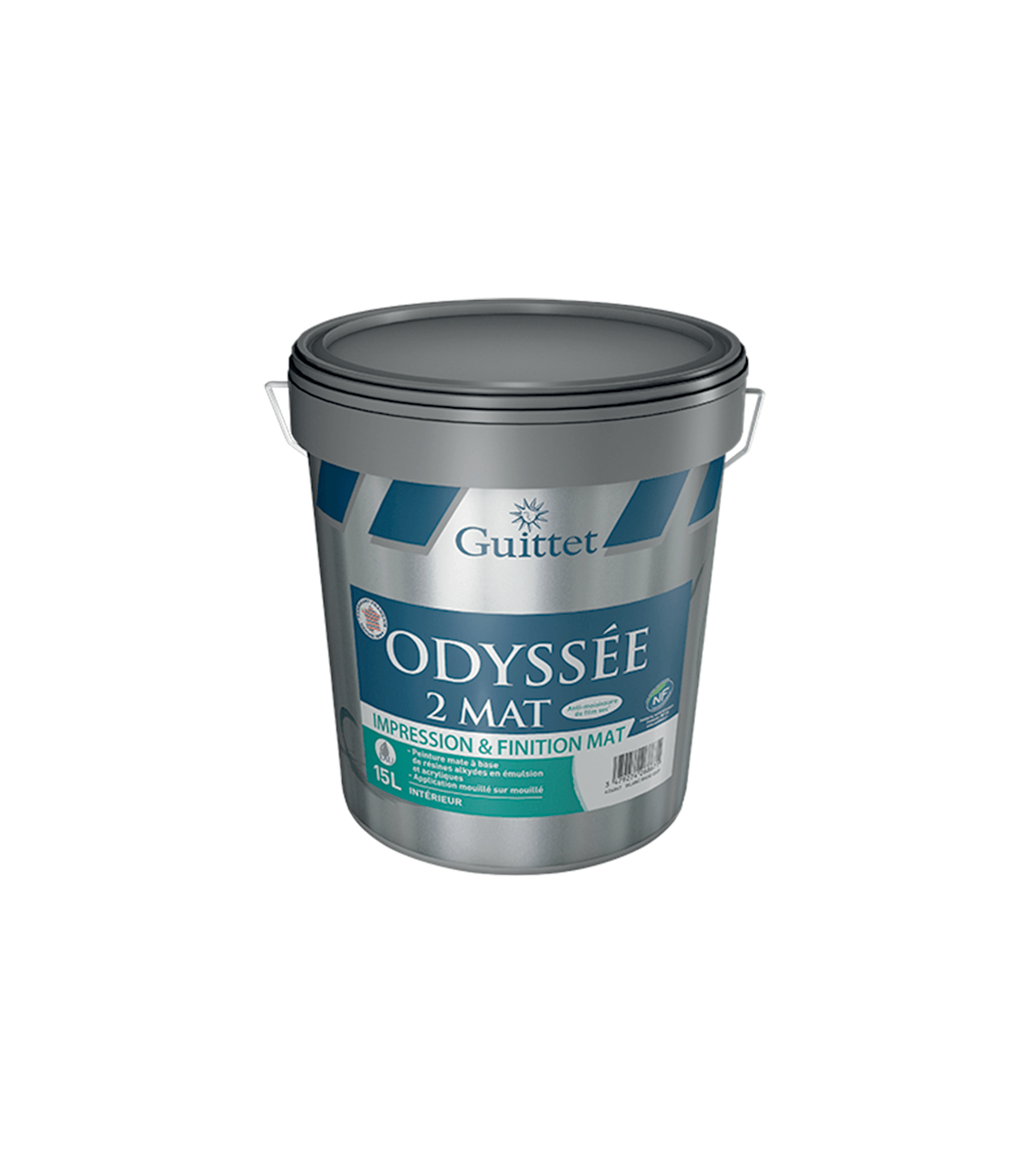 La peinture GUITTET ODYSSÉE 2 MAT est une peinture d’impression et de finition, applicable en direct sur les supports intérieurs : plâtre, plaque de plâtre, bois, PVC. Ce type de peinture offre un excellent rendu sur vos murs et plafonds. GUITTET ODYSSÉE 2 MAT est une peinture à base de résines alkydes en émulsion et acryliques. Elle est totalement lessivable sans aucune dégradation des couleurs.