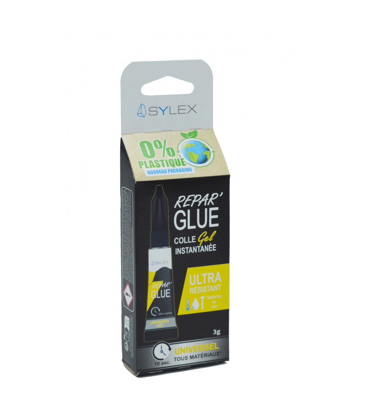 Colle instantanée universelle Répar'Glue Gel de Sylex. Cette colle en tube de 3g répare et fixe quasiment tous les matériaux.