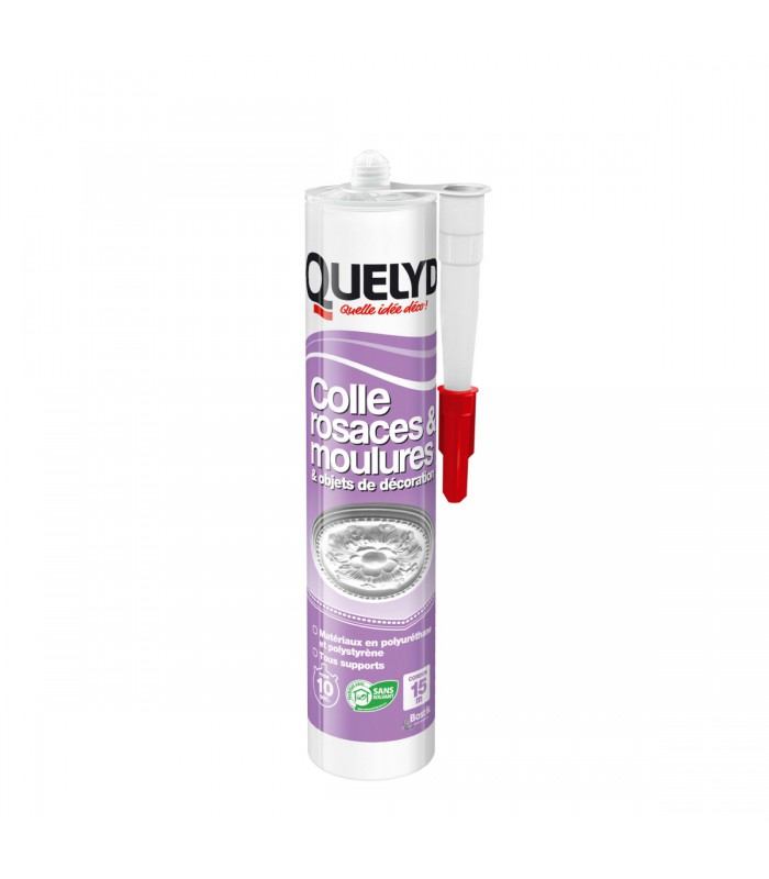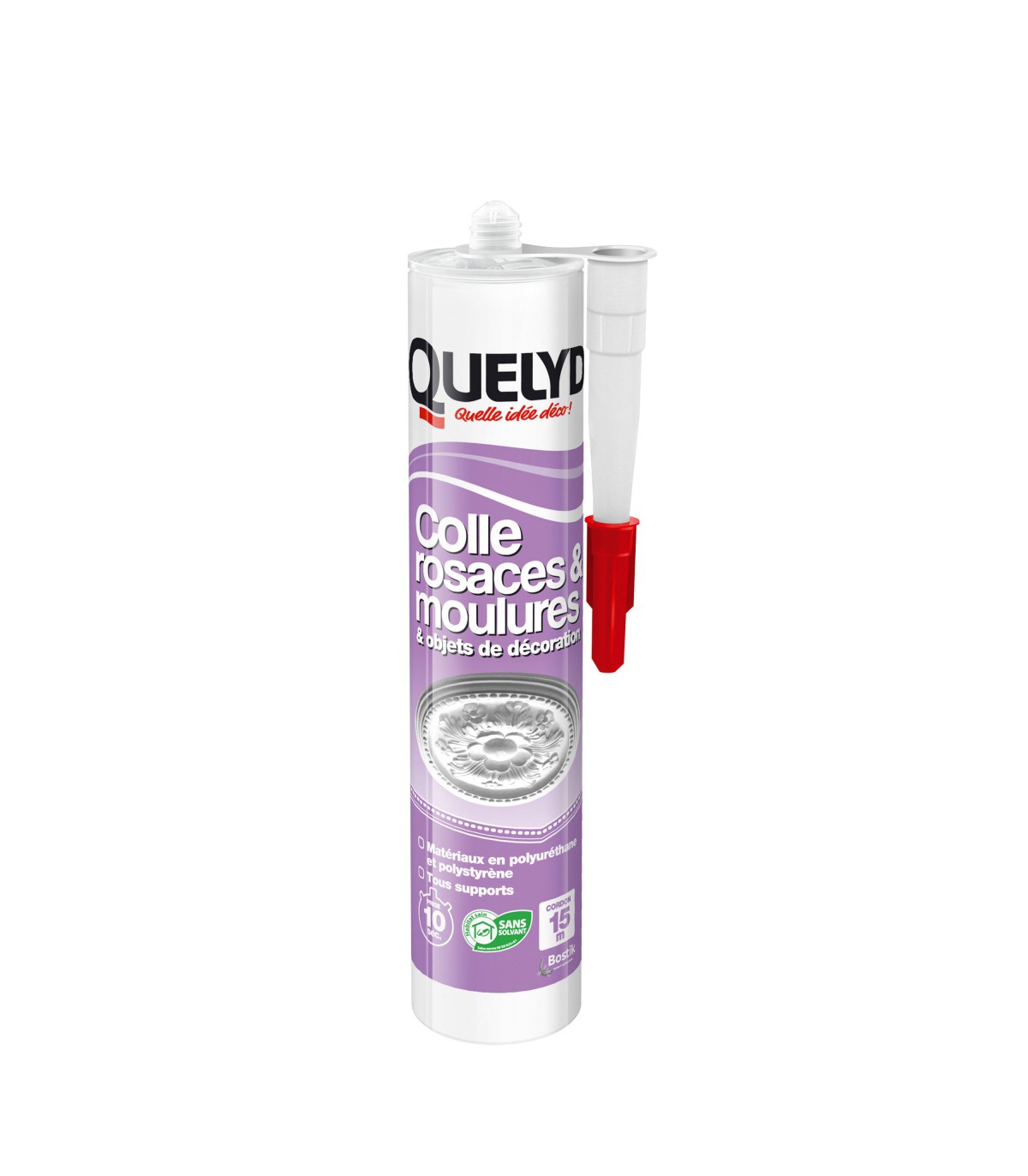 Collage de moulures, poutres, rosaces en polystyrène et polyuréthanne et frises décoratives en bois sur la plupart des matériaux. Résistance finale 100kg/cm². Sans solvant, sans odeur.