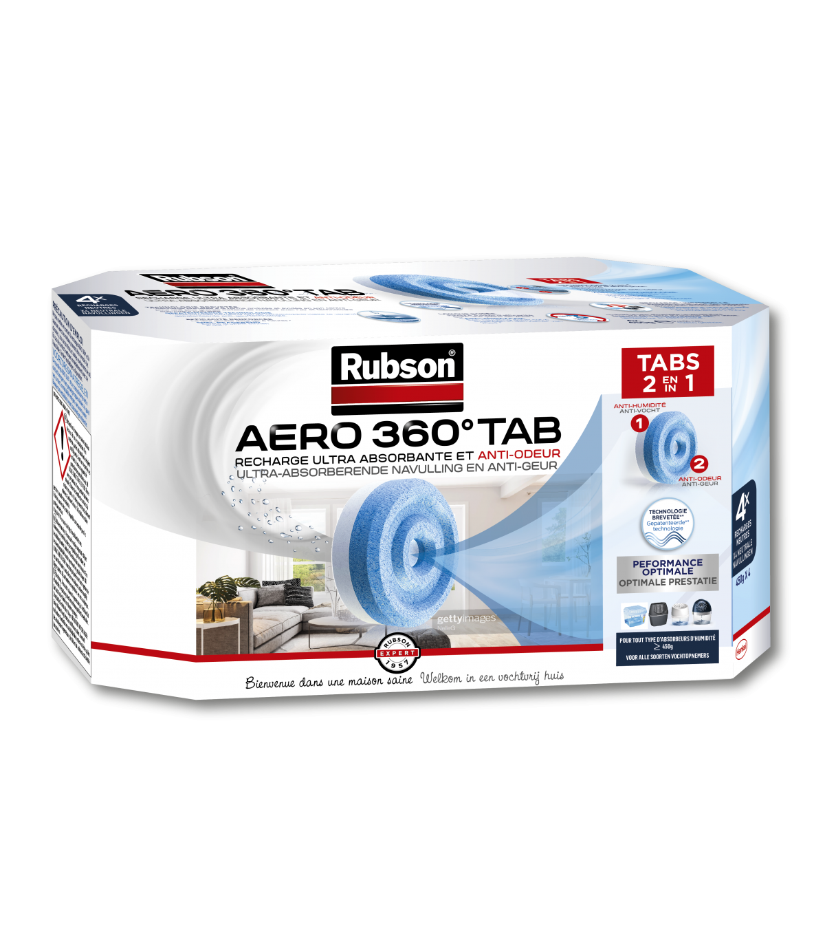 Lot de 4 recharges absorbeur humidité Rubson AERO 360 contre l'humidité ambiante. Une recharge est idéale pour une pièce de 20m².