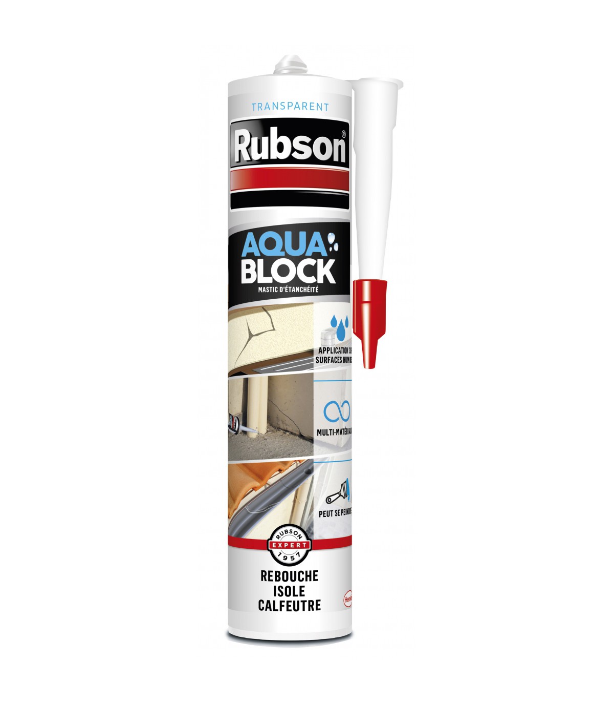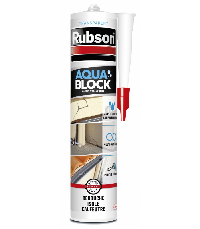 Le mastic d'étanchéité Rubson Aquablock transparent est un mastic monocomposant à base de polymère haute performance. Il permet de former un joint souple et étanche. Idéal pour le calfeutrement de fissures ou le collages sur tous types de surfaces en intérieur ou en extérieur. Le mastic d'étanchéité Aquablock Rubson est parfaitement adapté pour les finitions après l'utilisation du revêtement d'étanchéité Aquablock en spray ou en pot de 1kg et 5kg. Après application, le contact avec l'humidité de l'air lui permet de devenir un joint souple, résistant et élastique.