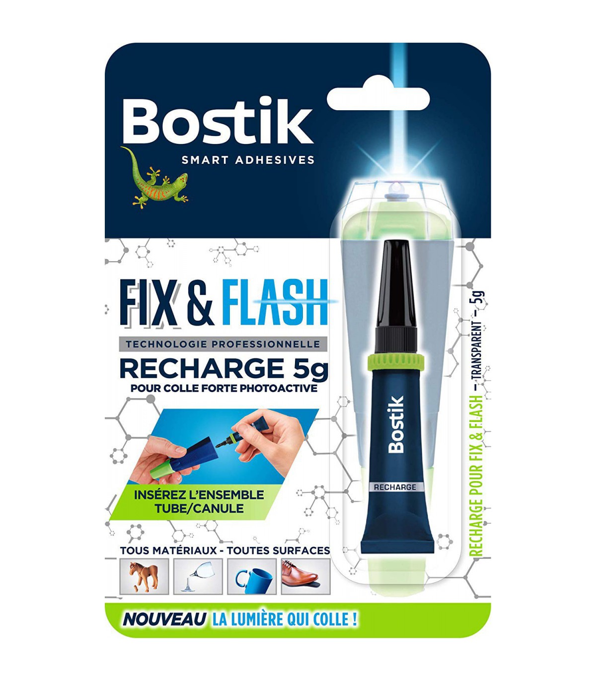 Recharge pour l'applicateur de colle Fix and Flash de Bostik : La lumière qui colle. Tube d'une contenance de 5g à intégrer dans l'applicateur lumineux Fix and Flash disponible en cliquant ici.