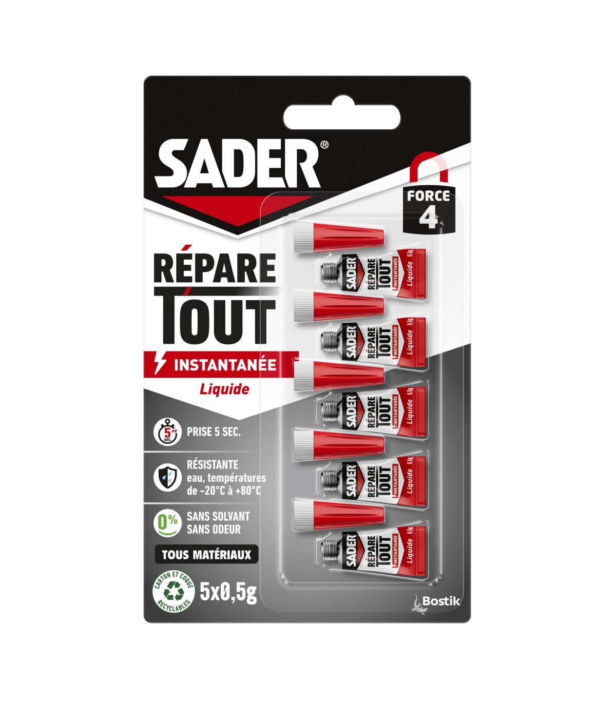 Colle extra forte liquide de Sader. Cette colle permet d'effectuer des collages très puissants en quelques secondes. Sa formule liquide facilite les collages sur surfaces larges et lisses. Application facile grâce à son embout applicateur.