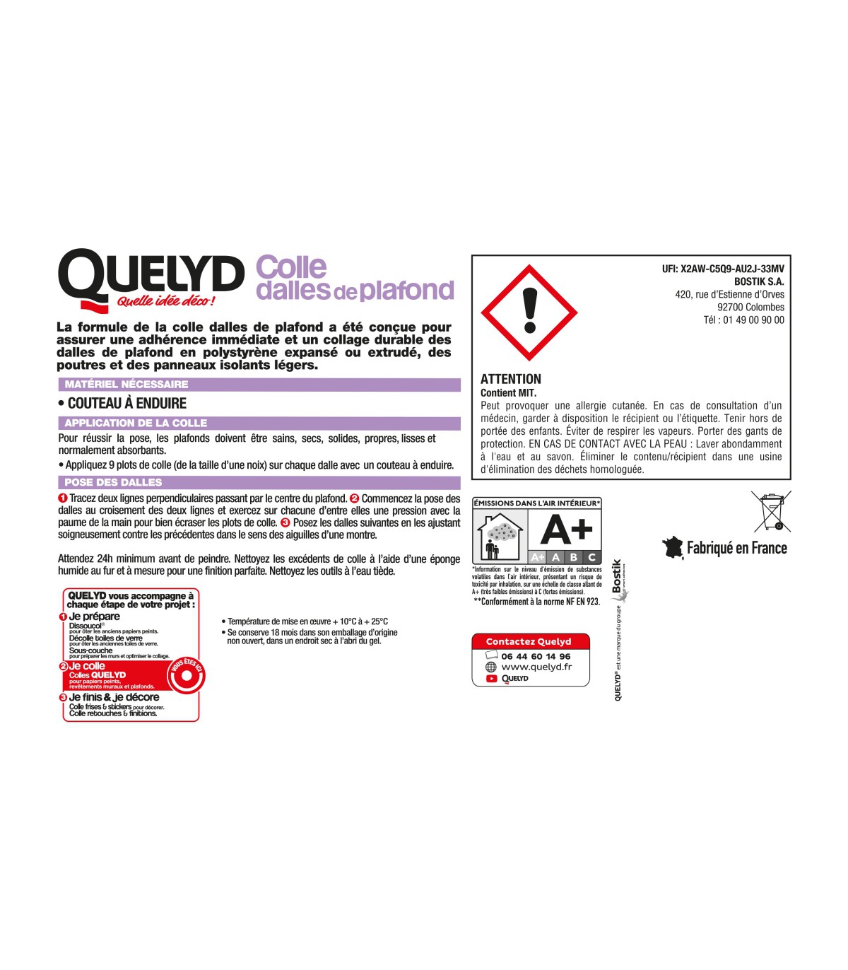Cette colle pour dalles de plafond Quelyd a été spécialement développée pour garantir une adhérence immédiate et un collage longue durée des dalles de plafond en polystyrène expansé ou extrudé, des poutres et panneaux isolants légers. Elle est conçue pour une utilisation en intérieur.