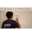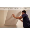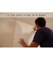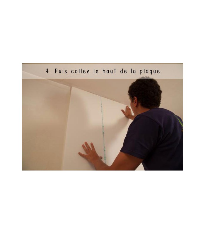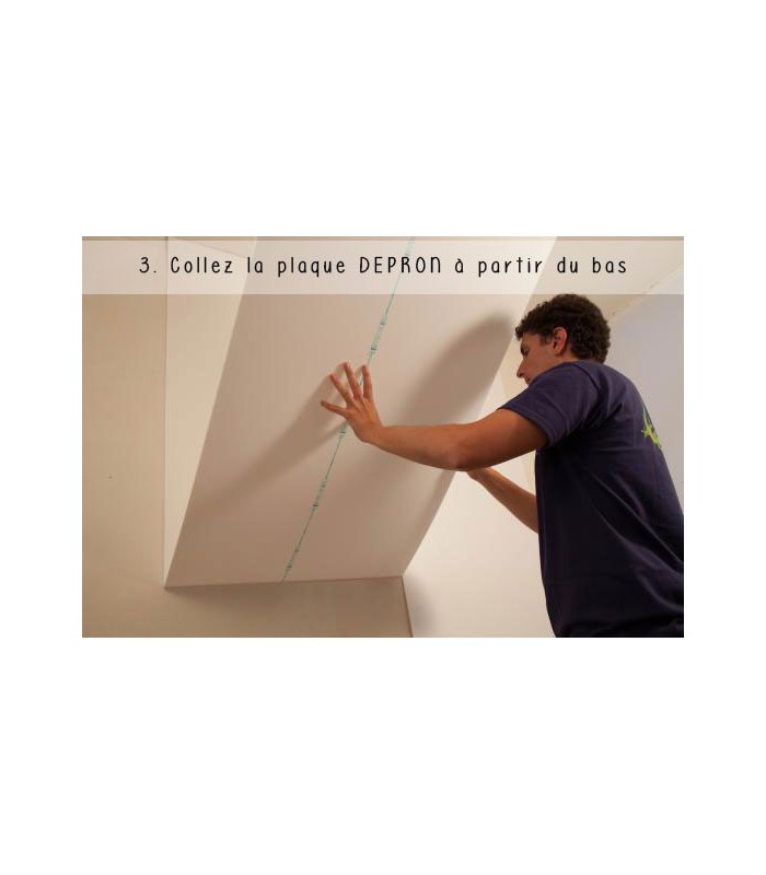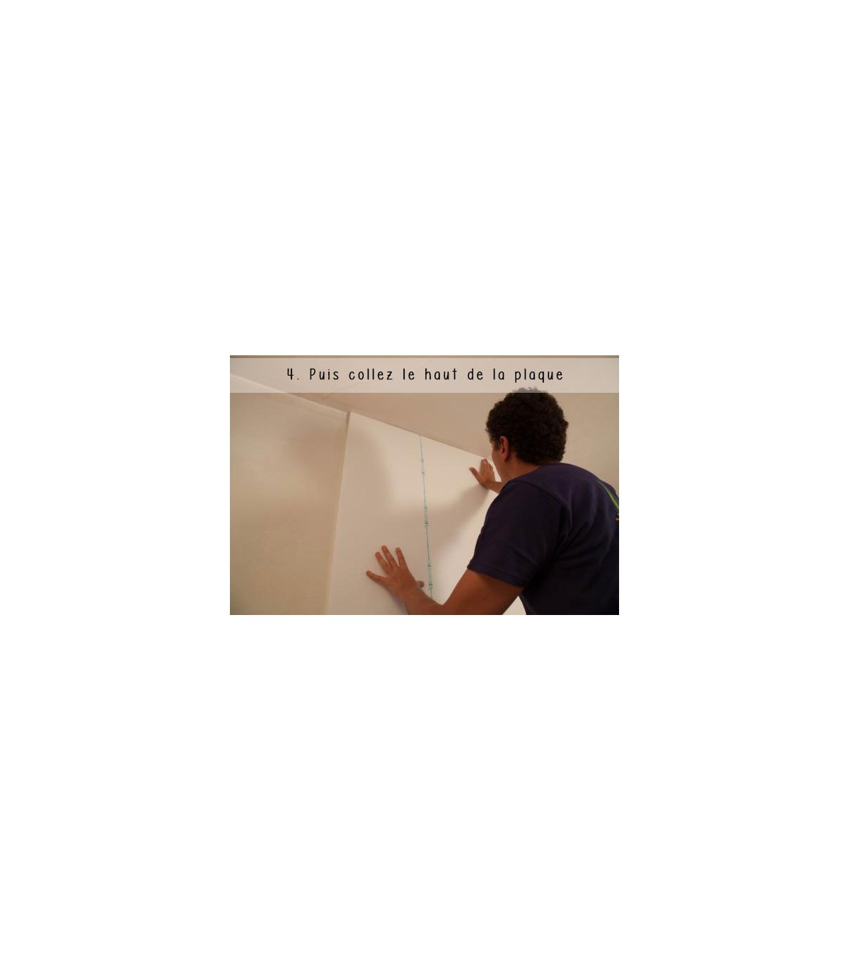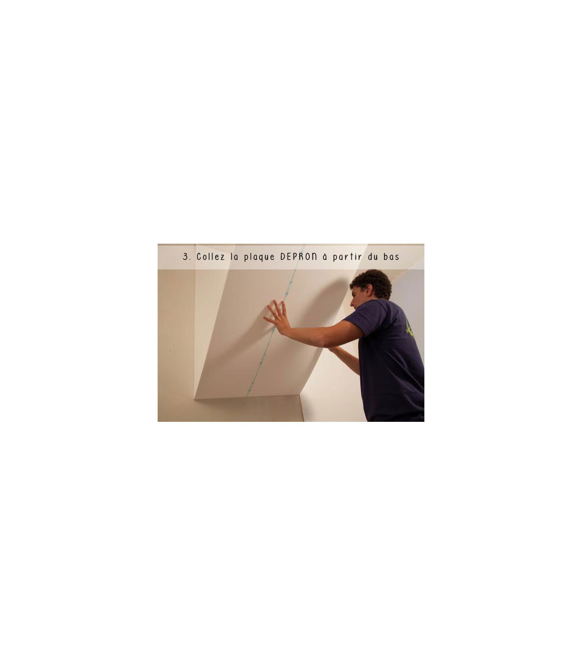 - Appliquer la première plaque Depron encore pliée en haut du mur, avec le côté imprimé DEPRON face au mur tout en appuyant de façon à bien répartir la colle