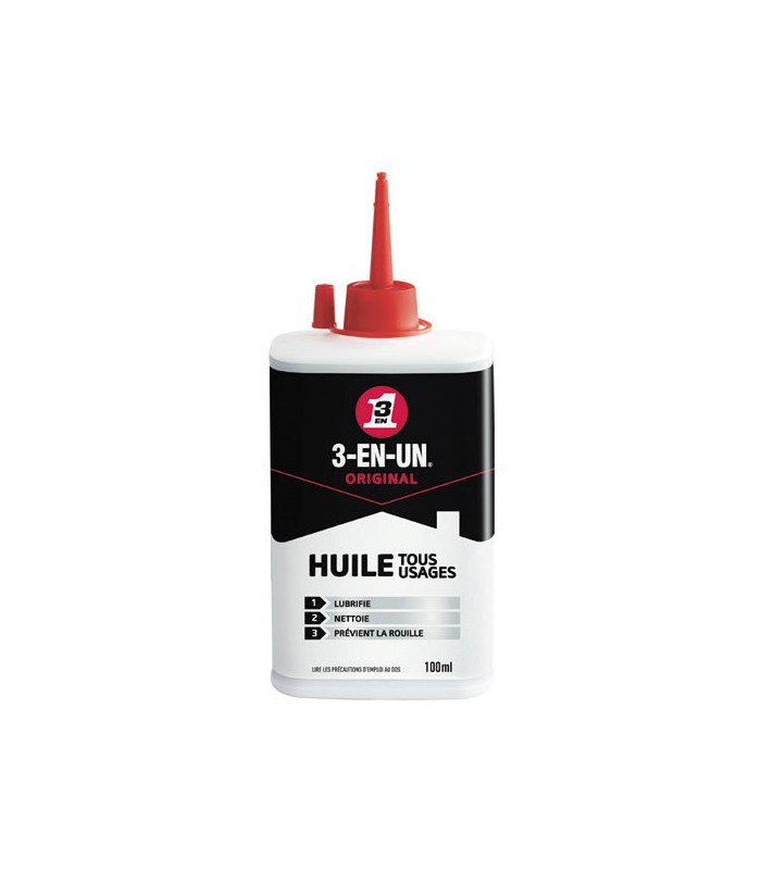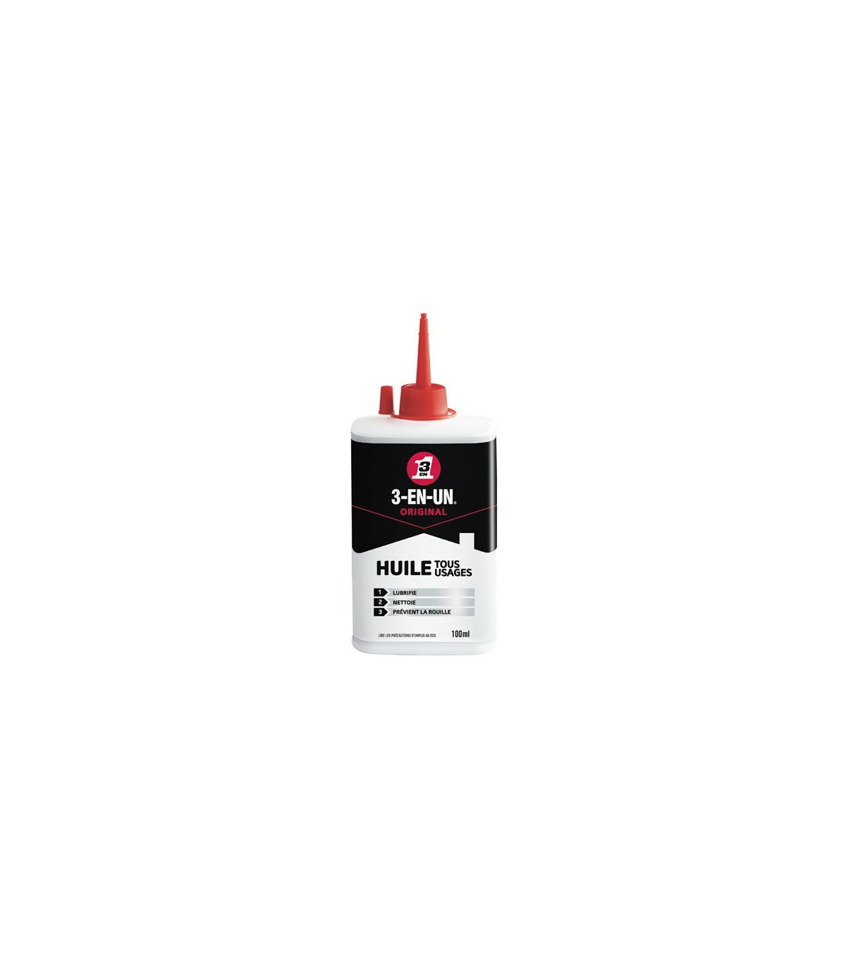 Huile tous usages en burette de marque 3-en-un. Formulé à base d'huile minérale pour lubrifier tout mécanisme, supprimer les grincements, nettoyer le métal et protéger de la rouille et de la corrosion.