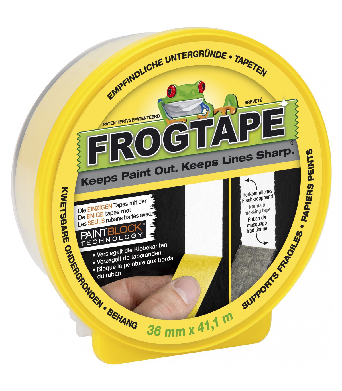 Le ruban adhésif FrogTape spécial Surfaces délicates est parfaitement adapté au masquage avant peinture sur les supports lisses et fragiles tels que les murs fraîchement peints et les revêtements en papier peint ou les bois traités.