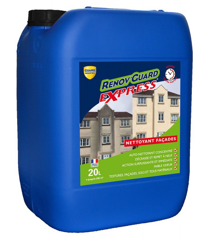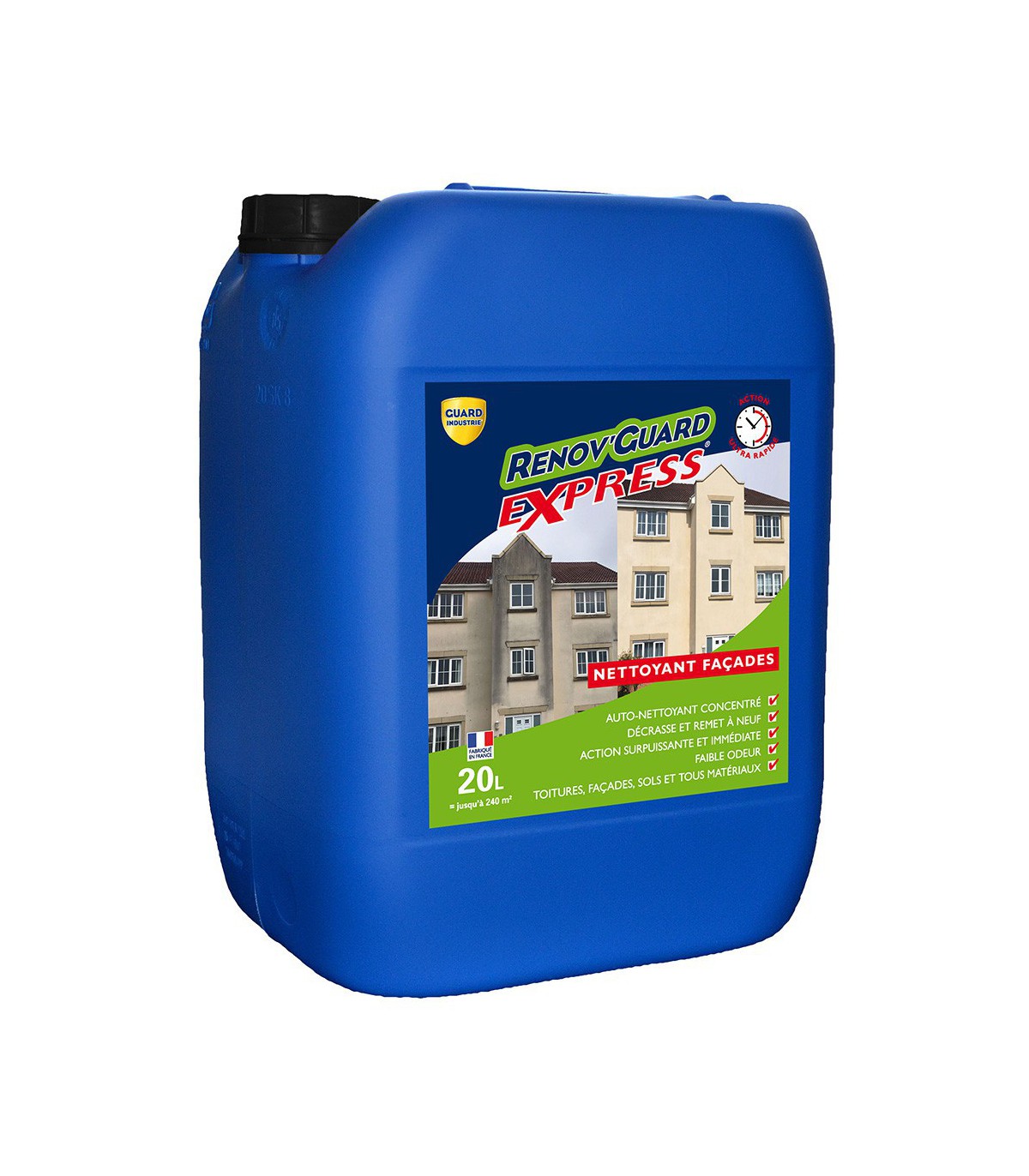 Rénov'Guard Express est un nettoyant spécial façades. Il permet de nettoyer et de remettre à neuf les façades et murs extérieurs, ainsi que les toitures et les sols marqués par la pollution atmosphérique. Efficace sur tous types de salissures.