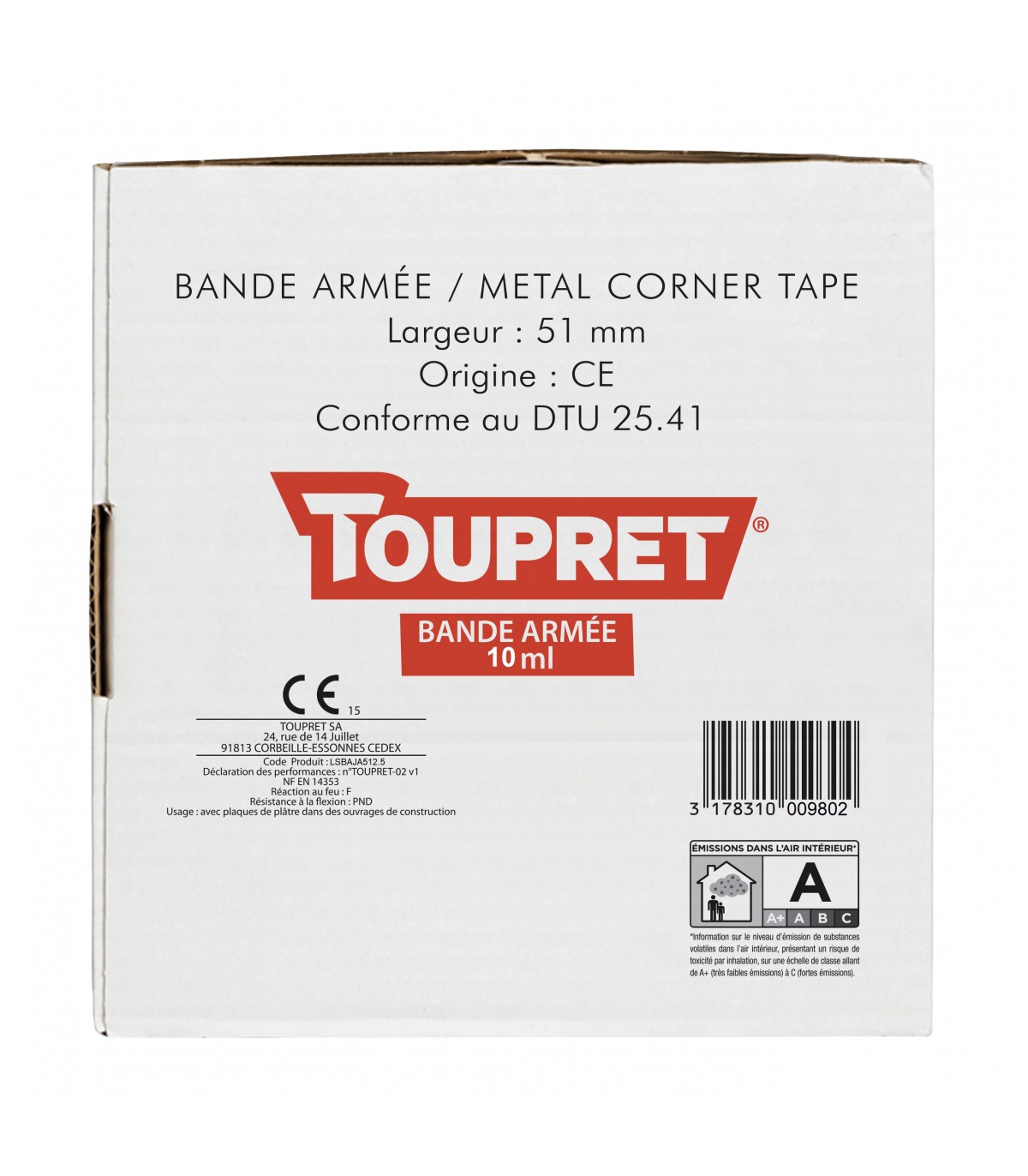 La bande de joint armé Toupret a des dimensions standards de 51 mm de largeur avec une épaisseur de 0,215 mm et un grammage de 138 g/m². Sa résistance à la rupture, supérieur à 4 N/mm, est parfaitement conforme au nomenclature NF EN 13963. Elle en fait un produit de choix pour les travaux les plus exigeants.
