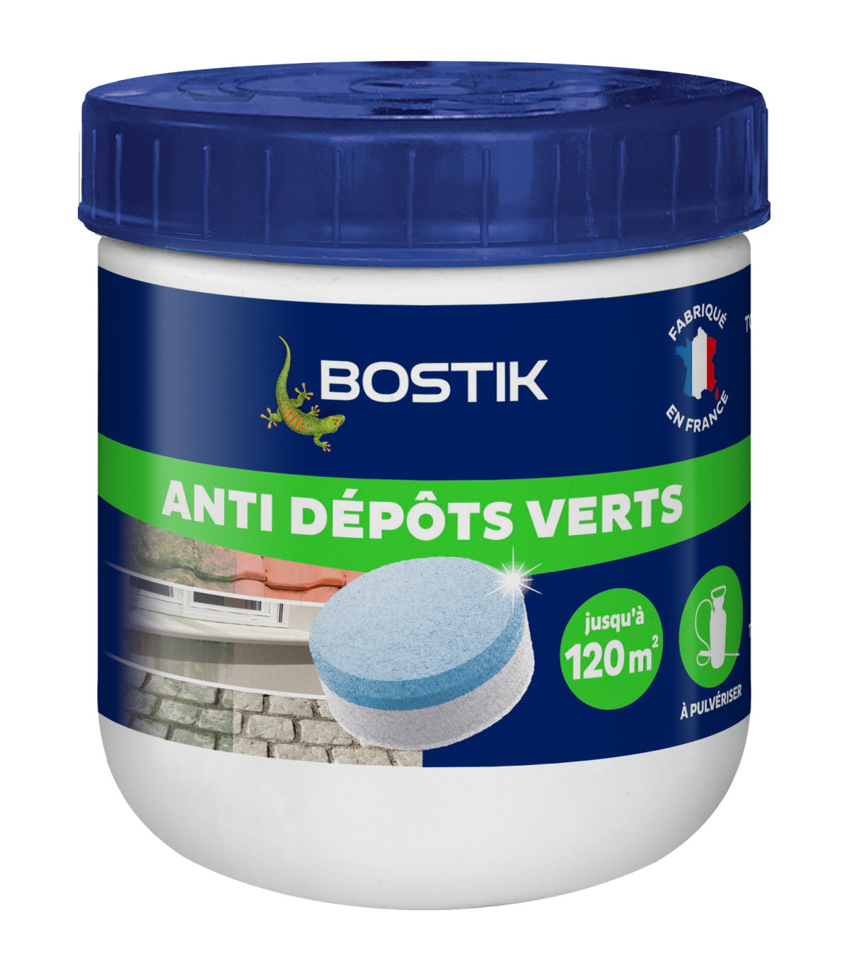 Développé récemment par Bostik, la tablette compacte anti-dépôt vert a exactement la même fonction que les traitements anti-mousses classiques mais a l’avantage d’être disponible en tablette soluble, à l’image des tablettes de lave-vaisselle. Et c’est un format qui révolutionne tout puisqu’il est désormais possible de traiter des surfaces considérables sans s’encombrer d’un bidon en plastique de 20 litres. Il est possible de traiter jusqu’à 120 m² avec un pot de 30 tablettes et le double avec un pot de 60 tablettes.