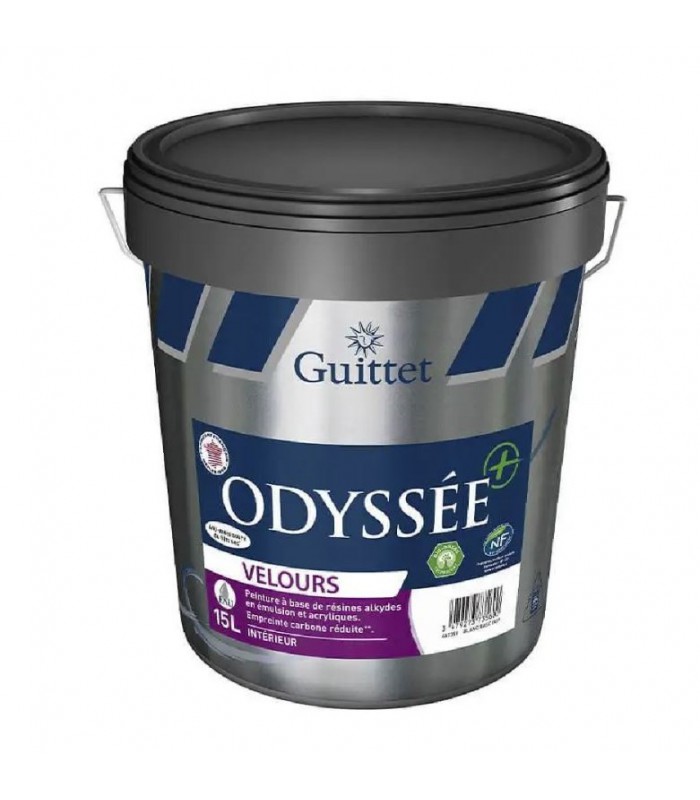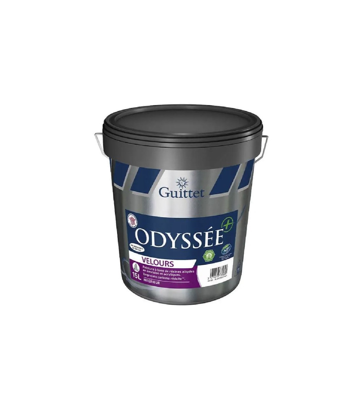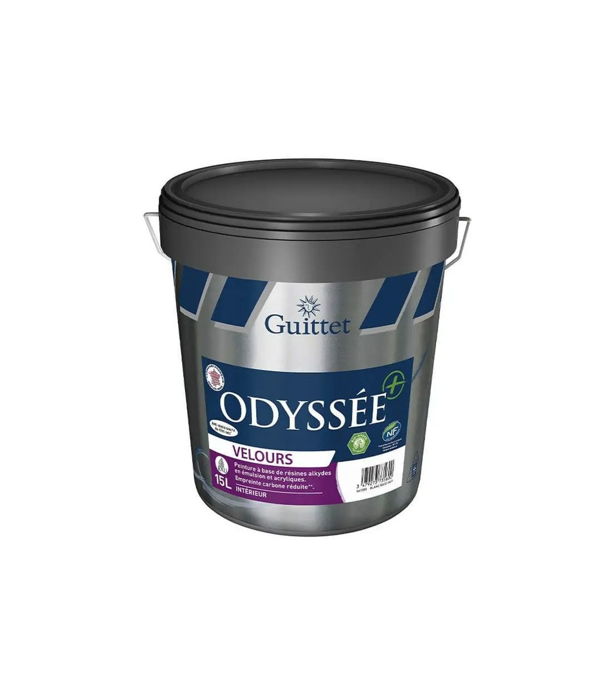 Odyssée+ VELOURS - Nouvelle Formule ! Sans concession sur la qualité ! Peinture veloutée avec aspect poché à base de résine alkyde en émulsion, et à base de résine biosourcée. Guittet a développé une nouvelle formule de son produit phare, avec un niveau de qualité inchangé et un impact moindre sur l’environnement. Ce produit contient au maximum 2 g/l COV. Il a été conçu pour répondre au besoin croissant de produits plus respectueux de la santé et de l'environnement. La peinture Odyssée + velours est donc compatible aux critères HQE™, LEED® et BREEAM®.
