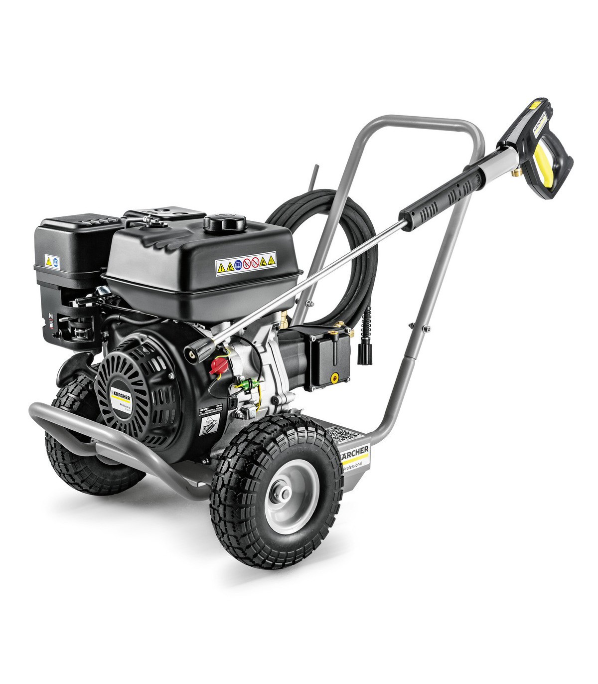 Partout où les sources d'énergie externes ne sont pas disponibles et où les tâches de nettoyage sont néanmoins exigeantes, notre nettoyeur haute pression à eau froide HD 8/23 G Classic avec moteur à essence UE STAGE V est le choix idéal. Avec une quantité d'eau par heure de 800 litres, une pression de travail de 230 bars et une pompe à vilebrequin robuste, l'appareil maîtrise également les tâches de nettoyage difficiles avec fiabilité. La poignée ergonomique, le rangement pour accessoires pratiques, les dimensions compactes et les roues increvables font du HD 8/23 G Classic un appareil extrêmement simple à utiliser, mobile et en plus facile à transporter en voiture. L'appareil se distingue également par ses composants facilement accessibles qui sont protégés de manière efficace par un grand filtre à eau ainsi que par une valve thermique et une soupape de sécurité. Pour éviter les dommages causés par des influences extérieures, l'appareil est doté d'un châssis tubulaire en acier extrêmement robuste. Il est donc parfaitement adapté aux nettoyages difficiles dans les secteurs du bâtiment, de l'industrie et de l'agriculture.