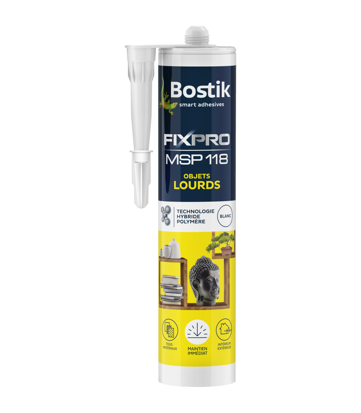 Le mastic FIXpro MSP 118 est connu pour coller les éléments lourds peu importe la surface (plafond, mur, verre, bois, placo, inox…). Il est efficace aussi bien pour des collages de tuyaux, plinthes, panneaux isolants que pour des collages d’éléments de décoration. Sa formule hybride polymère respecte la norme EN 923 car elle ne comporte aucun solvant dans sa composition. Il s’agit d’une colle de fixation qui permet d’adhérer à la plupart des supports (PVC, métal, bois et dérivés, polyuréthane, acier, aluminium, brique, pierre, verre, béton et même les supports humides) à l’exception de la polyéthylène et polypropylène.