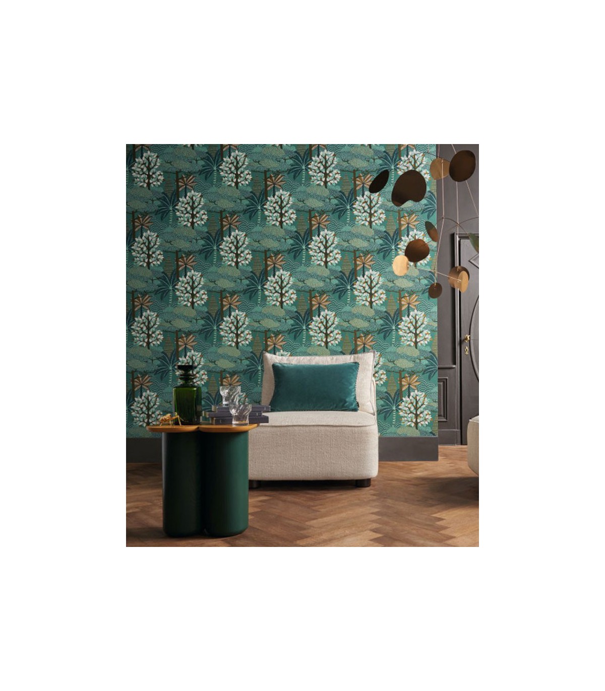 Sur un papier texturé rappelant la douceur des fibres végétales, se dessinent les contours de MARAKANDA. Cette cité lointaine, belle et mystérieuse sur la route de la soie, apporte chaleur et richesse à nos intérieurs. Une oasis enchanteresse prend vie dans le volume des encres métalliques et des encres mates. MARAKANDA est proposée dans une gamme de teintes douces et profondes, où le noir s’associe au doré, le marine au bois de rose, à l’opaline et à l’émeraude, comme pour mieux souligner le raffinement du graphisme.