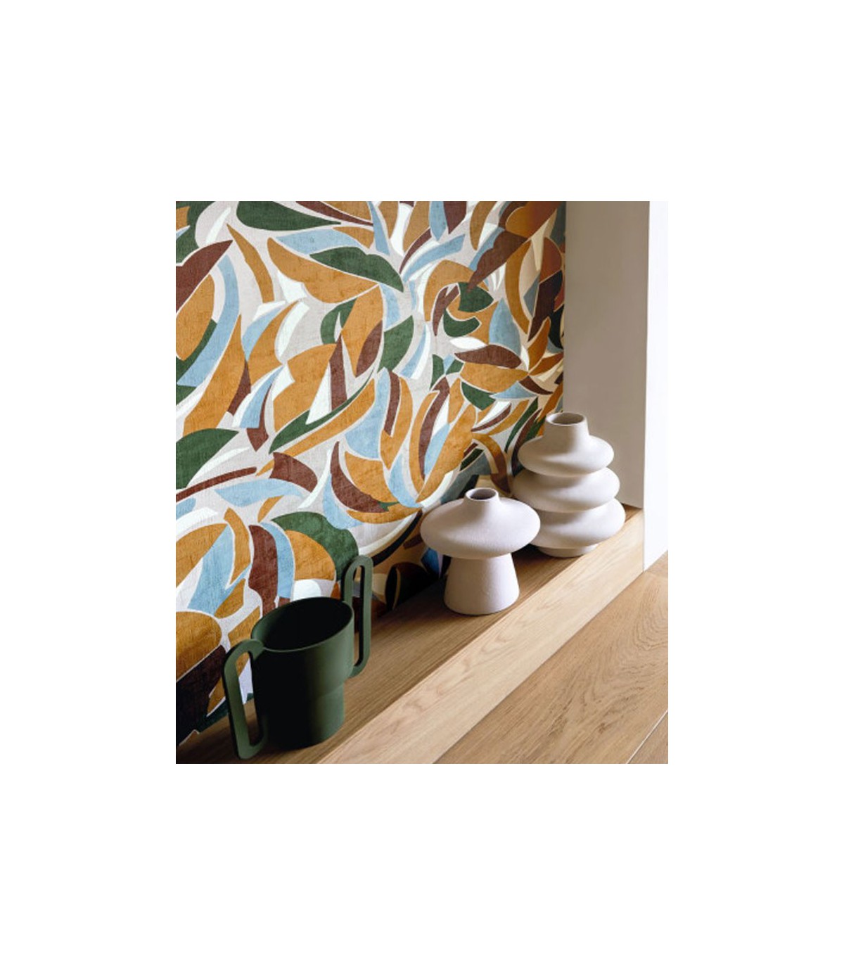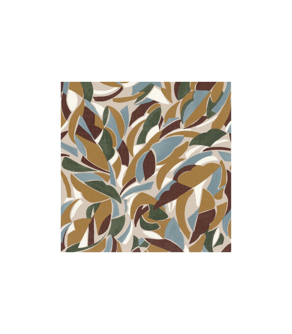 Le motif évoque une œuvre composée de multiples collages. Des aplats de couleurs semblent apposés de façon désordonnée, insufflant un caractère impétueux à la composition. Ils portent l’empreinte de la main de l’homme dans le tracé et du pinceau glissant sur la toile du peintre. Réalisée par héliogravure sur un grain irrégulier, l’impression permet une finesse dans le motif et le mélange de couleurs.