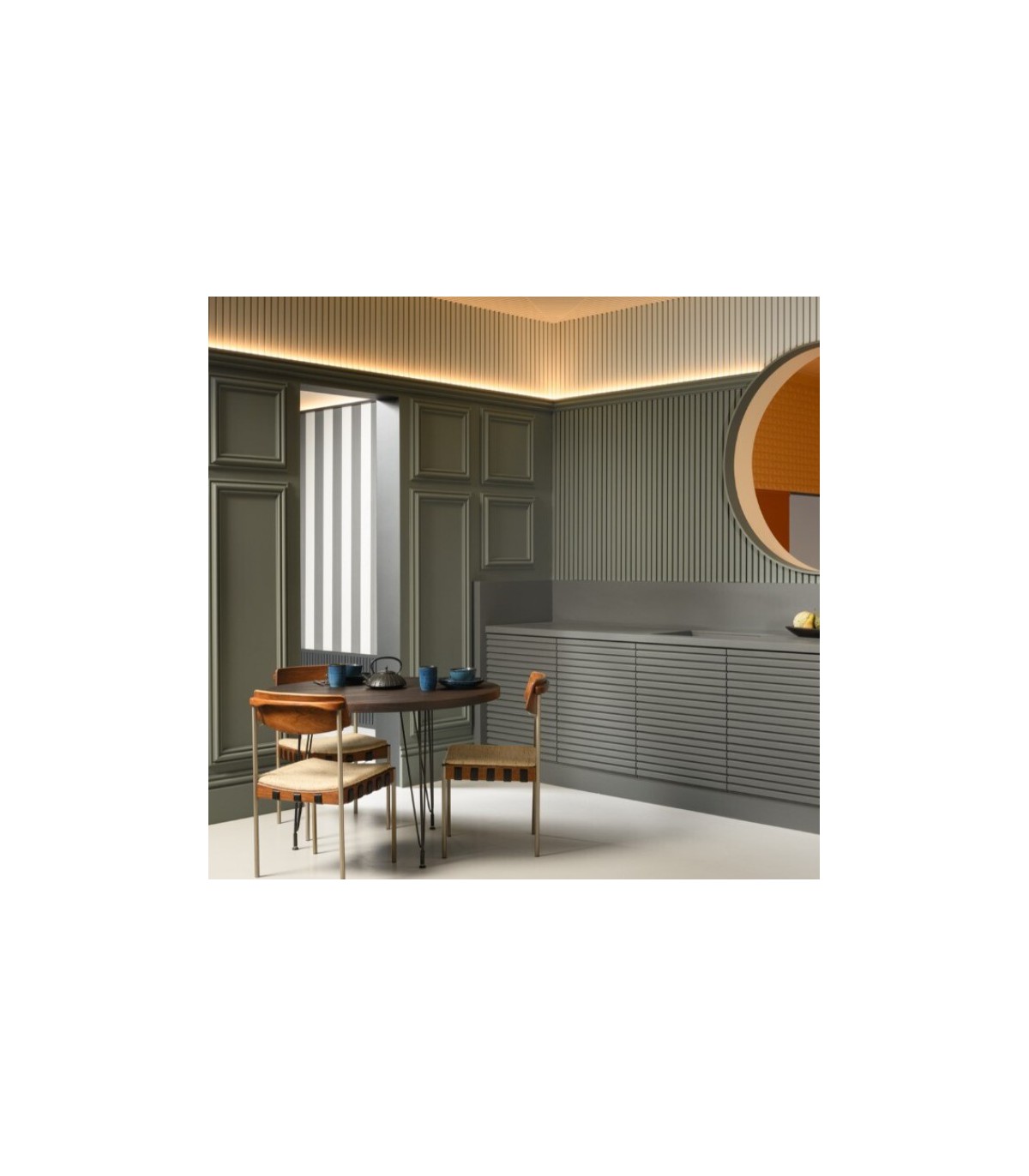Le W111 Bar permet de recouvrir les murs du sol au plafond, créant un effet spectaculaire et dynamique. Compatible avec les panneaux CX190 et SX194, il offre un rendu harmonieux et continu, idéal pour les salons, chambres ou bureaux.