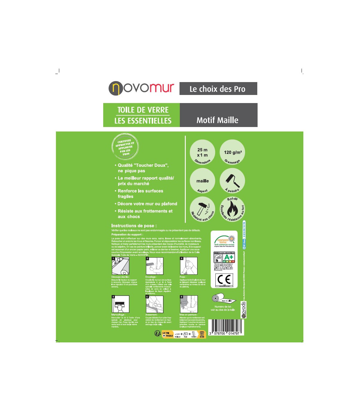 - Facile à Appliquer : Grâce à sa structure légère et à sa conception facile à manipuler, la toile de verre à peindre Novomur peut être installée sans tracas, même par les utilisateurs novices. Fini les tracas liés à la préparation des murs, cette toile de verre se pose aisément pour un résultat professionnel.