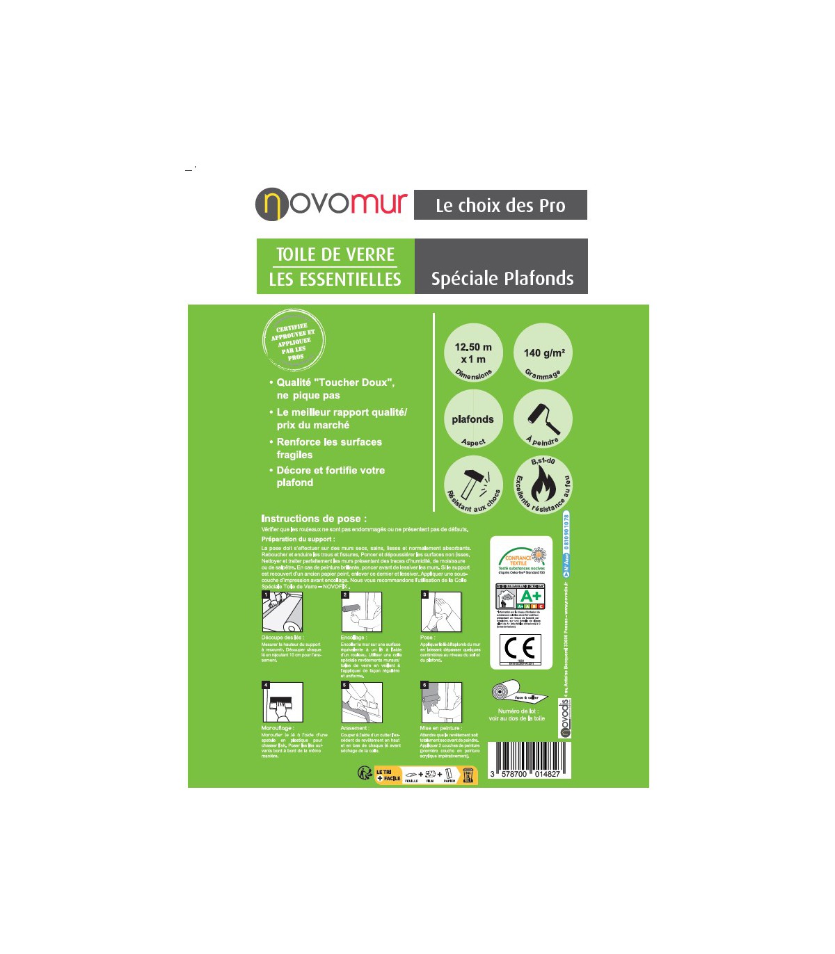 - Facilité d'Application : La Toile de Verre à Peindre Spéciale Plafond de Novomur est conçue pour une application aisée, même pour les débutants en bricolage. Sa texture souple permet une pose sans plis ni bulles, garantissant ainsi une surface parfaitement lisse et uniforme.