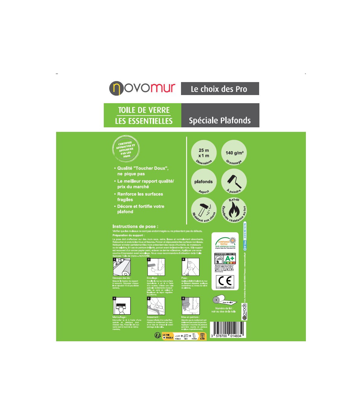 - Facilité d'Application : La Toile de Verre à Peindre Spéciale Plafond de Novomur est conçue pour une application aisée, même pour les débutants en bricolage. Sa texture souple permet une pose sans plis ni bulles, garantissant ainsi une surface parfaitement lisse et uniforme.