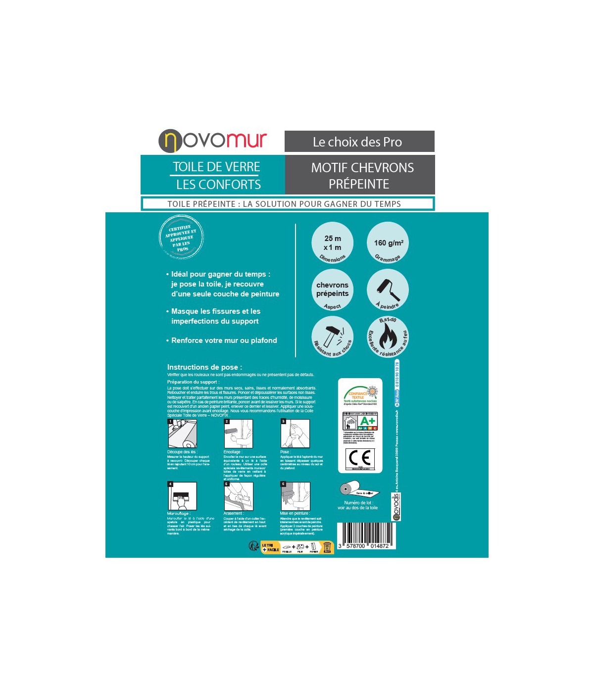 Grâce à sa structure légère et à sa conception facile à manipuler, la toile de verre prépeinte Novomur peut être installée sans difficultés, même par les utilisateurs novices. Fini les problèmes liés à la préparation des murs, cette toile de verre se pose aisément pour un résultat professionnel. Sa largeur de 1m permet de recouvrir d'un geste tout un pan de mur en déroulant le rouleau. Disponible en rouleau de 25 mètres.