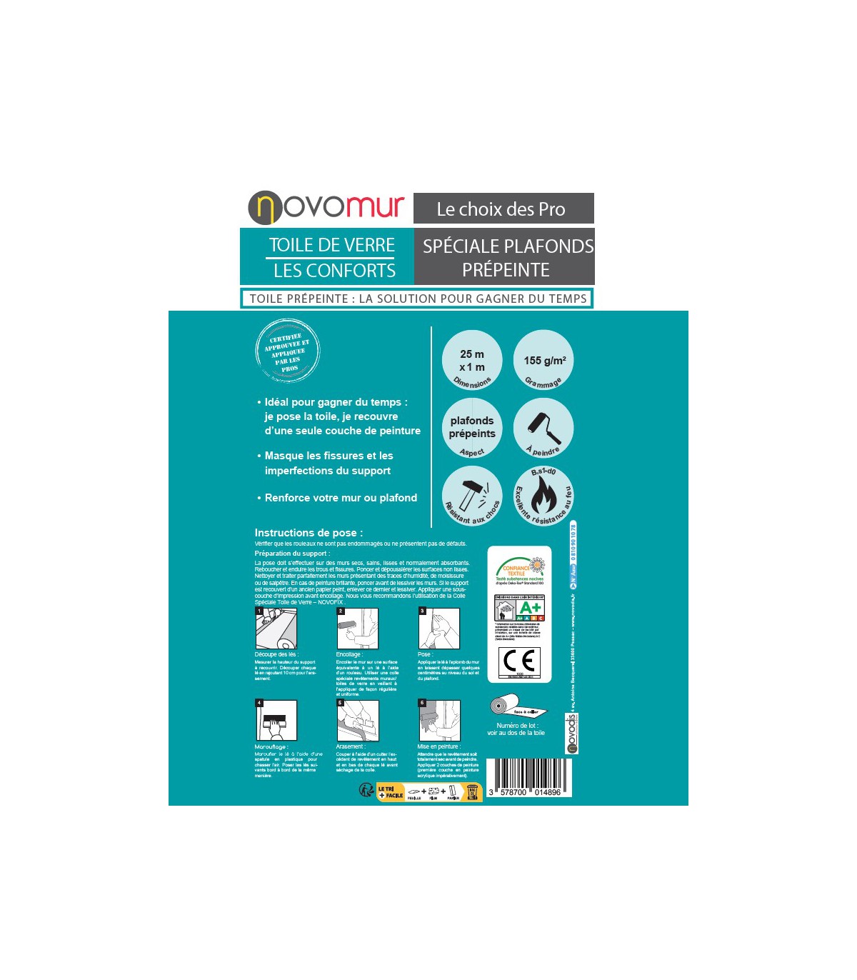 - Facile à Appliquer : Grâce à sa structure légère et à sa conception facile à manipuler, la toile de verre prépeinte spéciale plafonds Novomur peut être installée sans difficultés, même par les utilisateurs novices. Fini les problèmes liés à la préparation des murs, cette toile de verre se pose aisément pour un résultat professionnel. Sa largeur de 1m permet de recouvrir d'un geste tout un pan de mur en déroulant le rouleau. Disponible en rouleau de 12,5 mètres et 25 mètres.