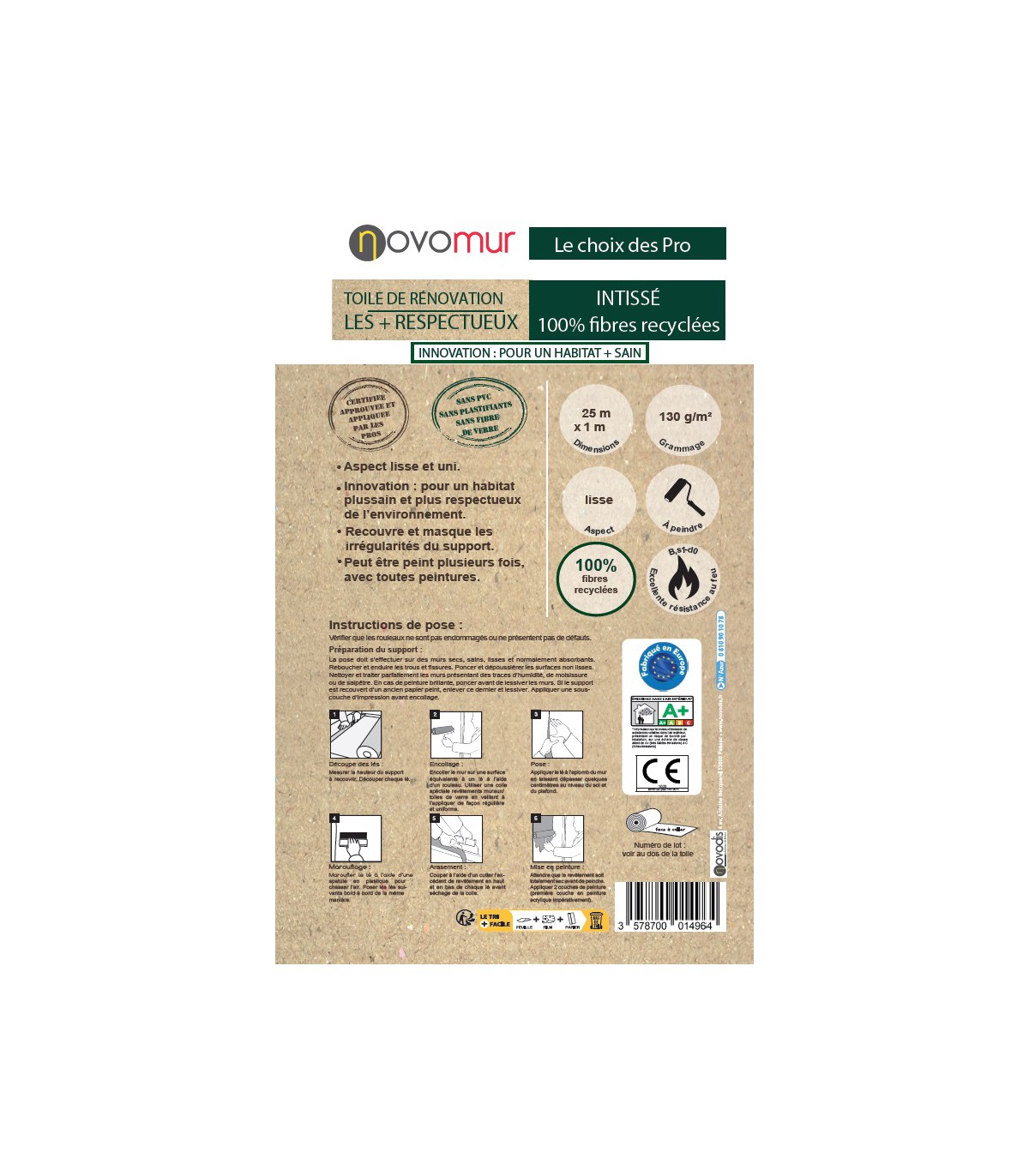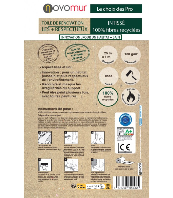 Ecologique : Cette toile de rénovation est composée à 100% de fibres recyclés pour un habitat plus sain et plus respectueux de l’environnement. La toile de 130g/m² est l’alternative écologique à la plupart des toiles de verre « classiques ». Elle a été conçue pour répondre à la demande croissante de revêtement muraux respectueux de l’environnement et sains.
