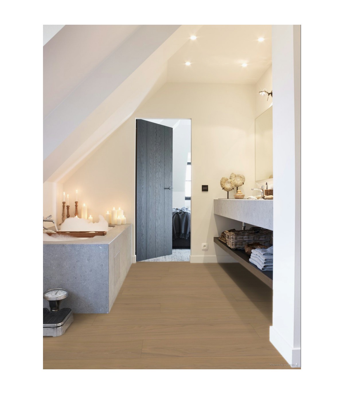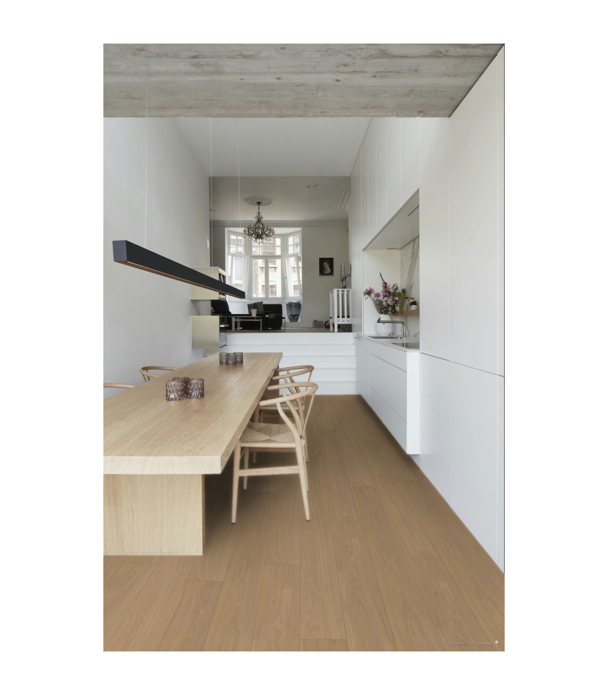 Le vernis Ultimtec protège efficacement tout en conservant un rendu bois naturel très réaliste. La finition extra mate renforce l’effet authentique du parquet contrecollé haut de gamme.