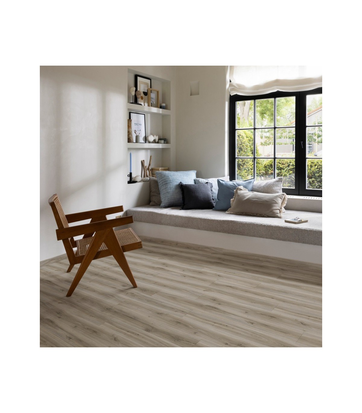 Ce sol en dalle PVC saisit avec précision la beauté naturelle du chêne classique. Avec des tons gris, il apporte une sensation de tranquillité à votre pièce.