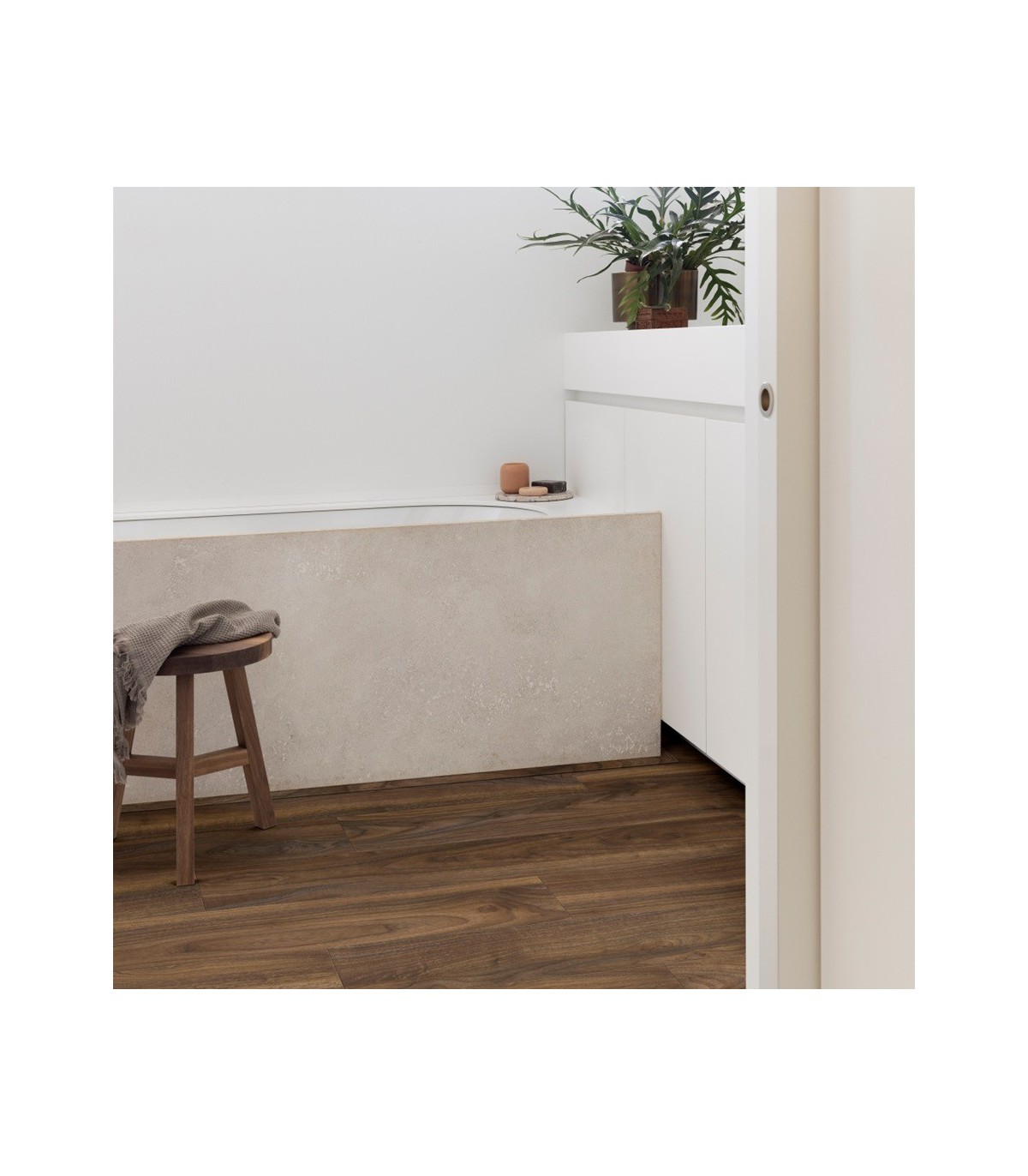 L’autre gros avantage de la collection Roots est qu’il permet des associations qui n’auraient pas été possibles avec le matériau naturel d’origine. Il est par exemple souvent déconseillé d’installer un sol en bois dans une salle de bain car l’eau et le bois ne font pas bon ménage. Mais avec le Sol en PVC roots il est désormais possible d’obtenir le contraste qu’on aurait eu avec un matériau sensible sans en subir les conséquences.