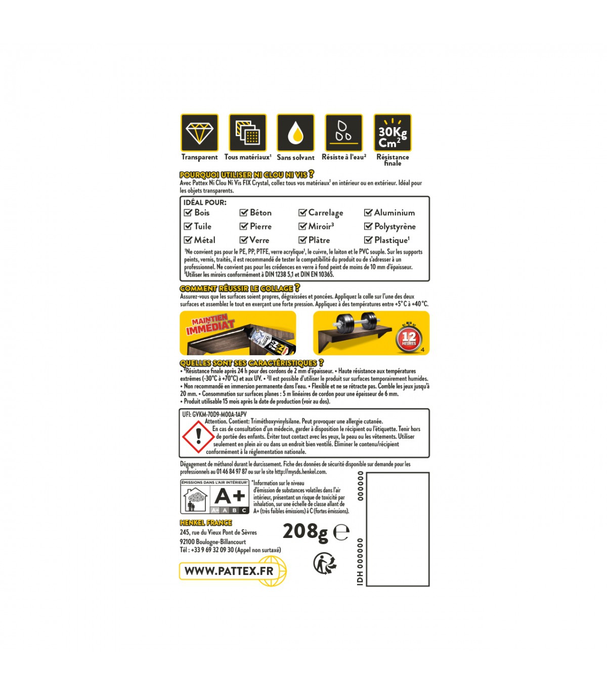 Découvrez Pattex ni clou ni vis fix - Crystal, une colle polymère transparente dotée de la Technologie Flextec sans solvant et sans odeur. Grâce à sa technologie, elle assure un maintien immédiat et reste positionnable pendant 15 minutes pour un rendu parfait.