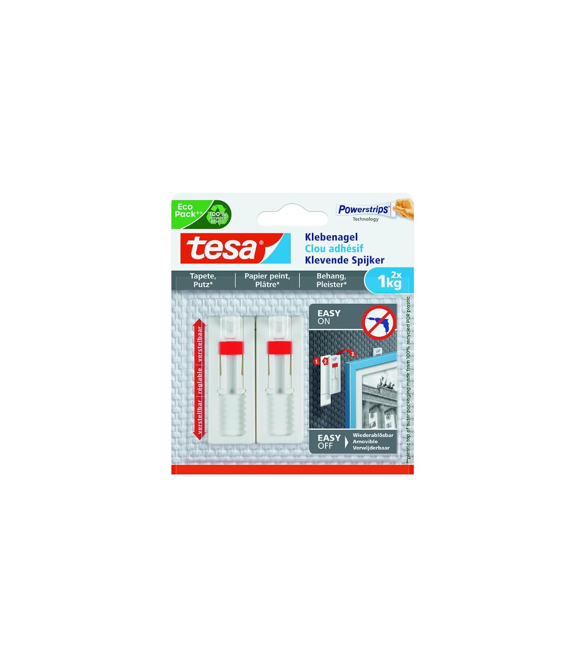 Clou adhésif ajustable idéal pour accrocher et aligner des tableaux jusqu'à 1kg sur surfaces délicates et à relief comme le papier peint et le plâtre.