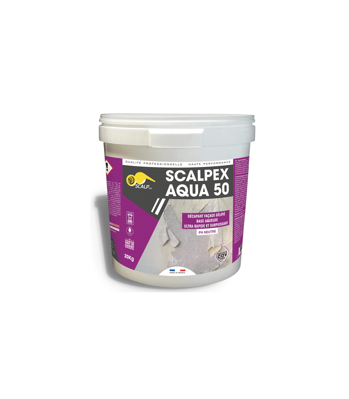 Scalpex Aqua 50, le décapant façade rapide et extrêmement puissant. Ce produit a été spécialement concç pour le décapage de peintures du bâtiment telles que les RPE (revêtements plastiques épais), les imperméabilisants et les films minces, sur une variété de supports tels que le plâtre, le béton, la pierre et la brique.