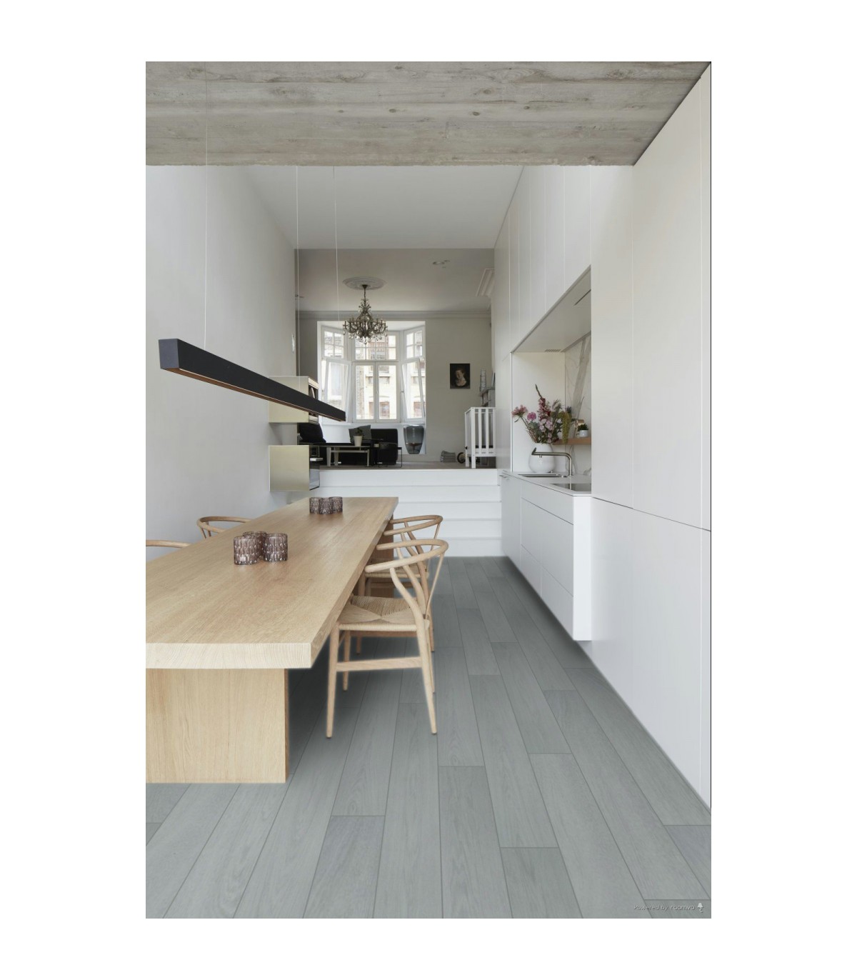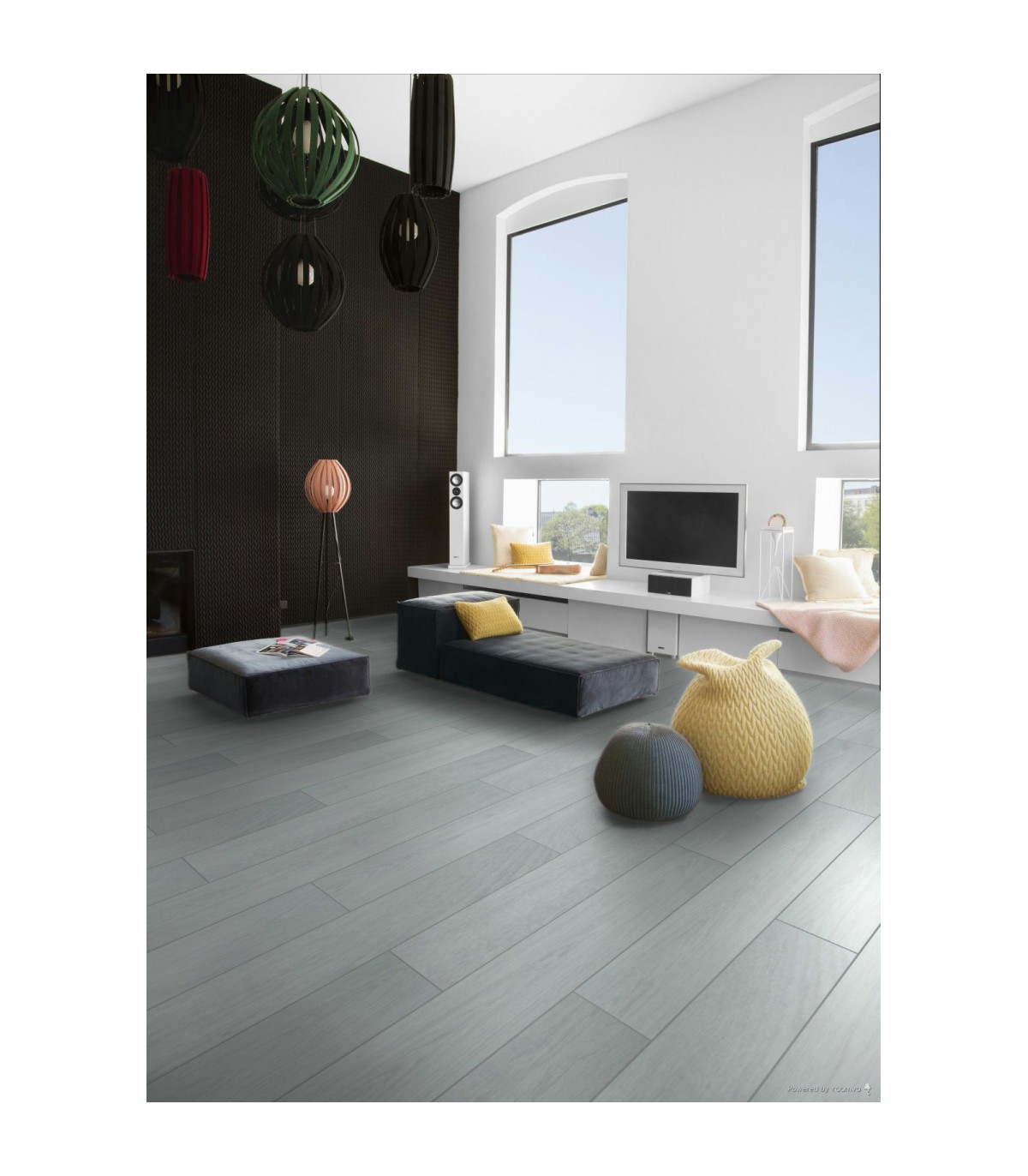 Le parquet stratifié Ocean+ Charme White se caractérise par une teinte de bois gris blanc lumineuse et légère. Ce parquet est idéal pour créer une ambiance moderne et épurée dans une pièce.