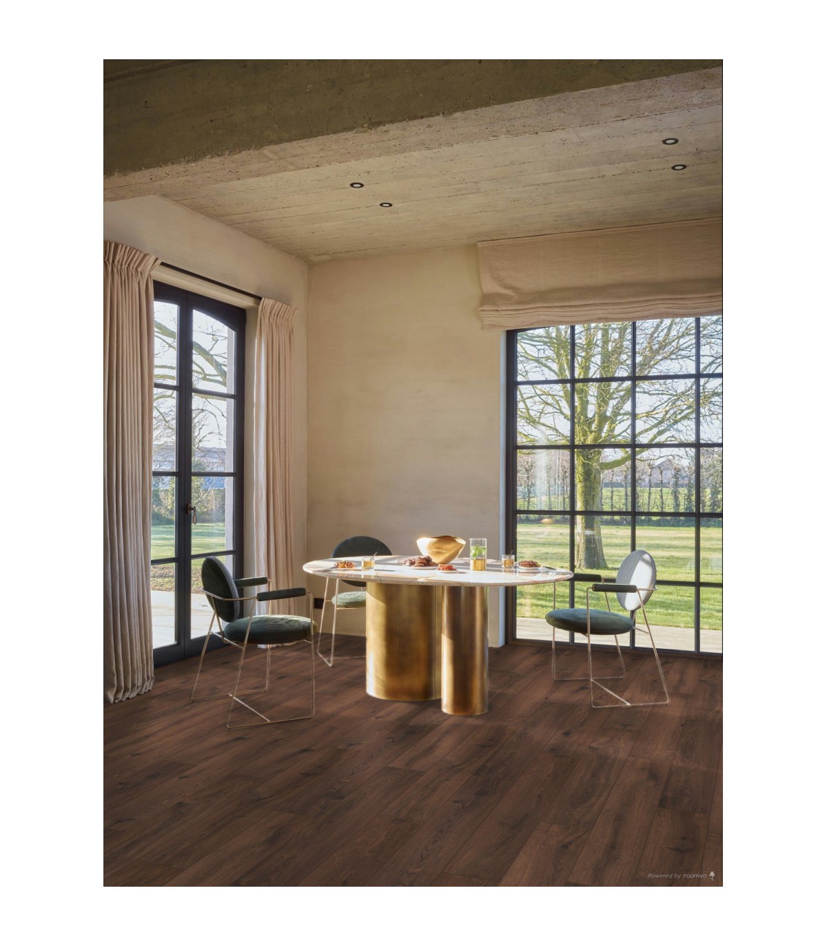 Le parquet stratifié Ocean+ Gyant Warm Brown 4125 se caractérise par une teinte de bois marron foncé, une teinte chaleureuse qui s'adaptera facilement à votre décoration d'intérieur. Le parquet Gyant Warm Brown est souvent utilisé pour créer un contraste avec une pièce aux murs blancs ou en pierre. Il s'associe très bien à des meubles en bois clair.