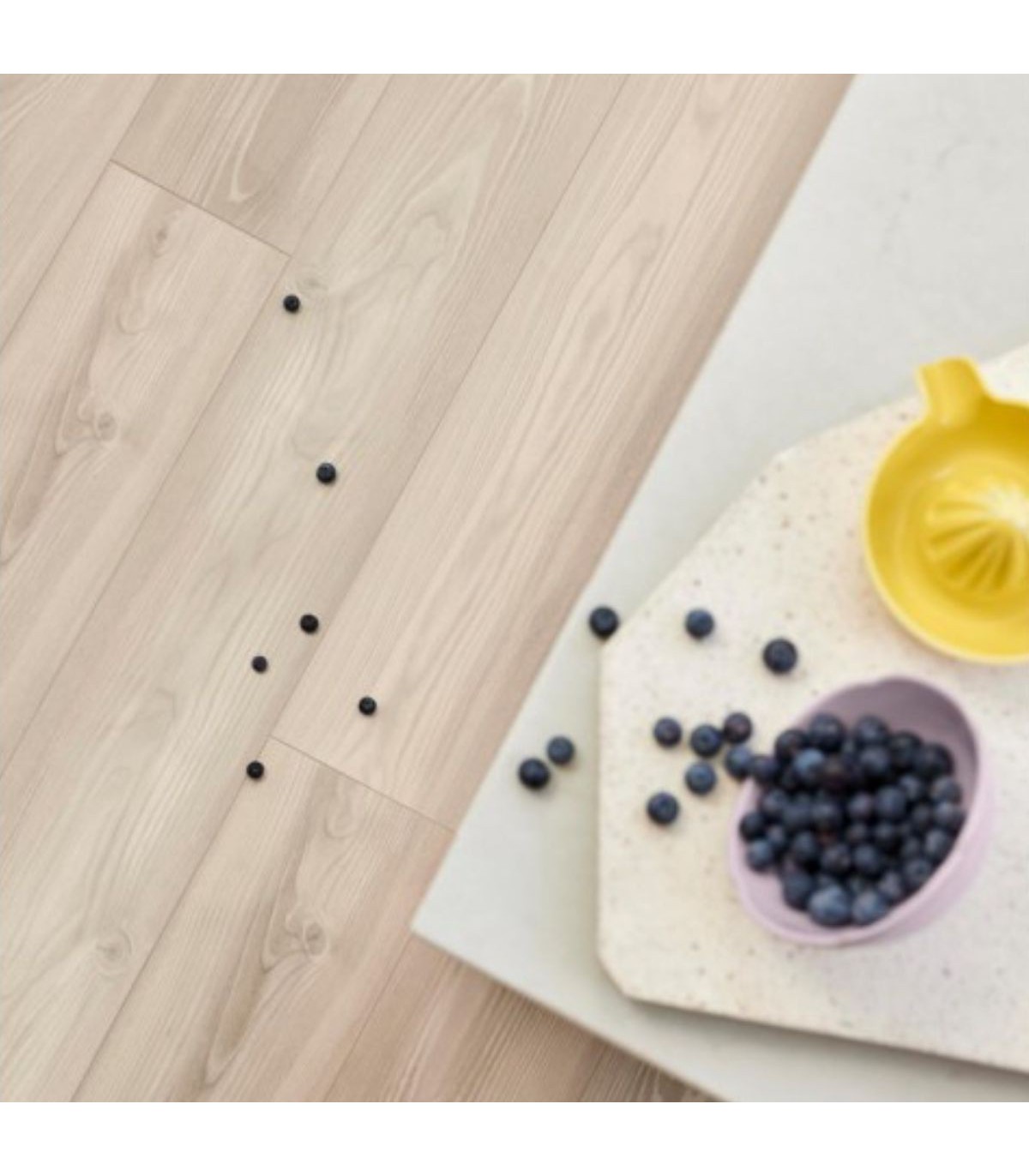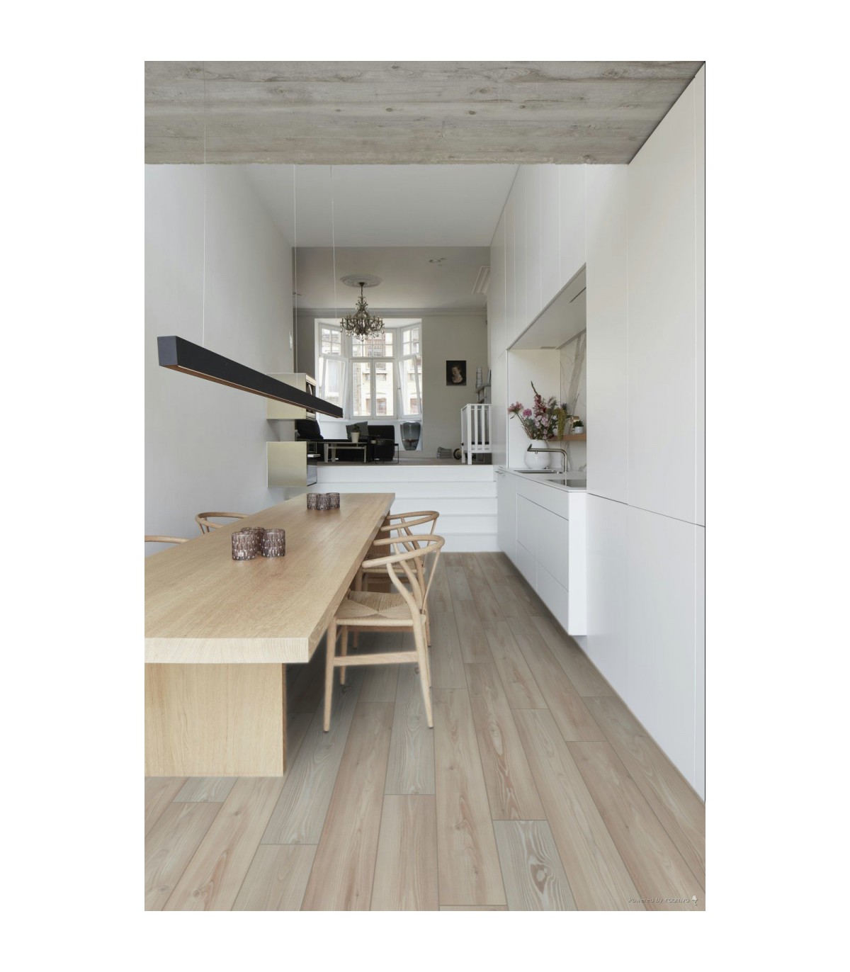 Le parquet stratifié Ocean+ Ragnar Light 8523 se caractérise par une teinte de bois beige très clair, quasiment blanc, proche du pin résineux. Elle fait référence aux teintes de bois claires souvent utilisés en Norvège/Suède (d'où son nom) et permettra de souligner élégamment un mobilier en bois plus sombre. Cette teinte de bois contribue à créer une atmosphère sophistiquée et élégante.