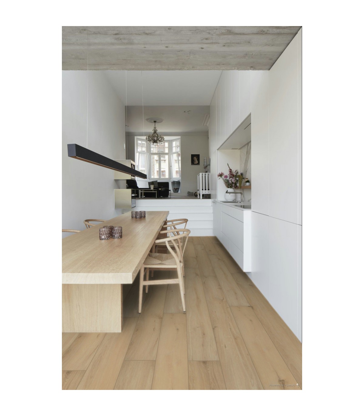 Le parquet stratifié Ocean+ Gyant Sand Natural se caractérise par une teinte de bois de couleur sable qui s'apparente au pin résineux, une teinte qui s'adaptera facilement à votre décoration d'intérieur. Le parquet Gyant sand natural est souvent utilisé pour créer un contraste avec une pièce aux murs blancs ou en pierre. Il s'associe très bien à des meubles en bois sombre.